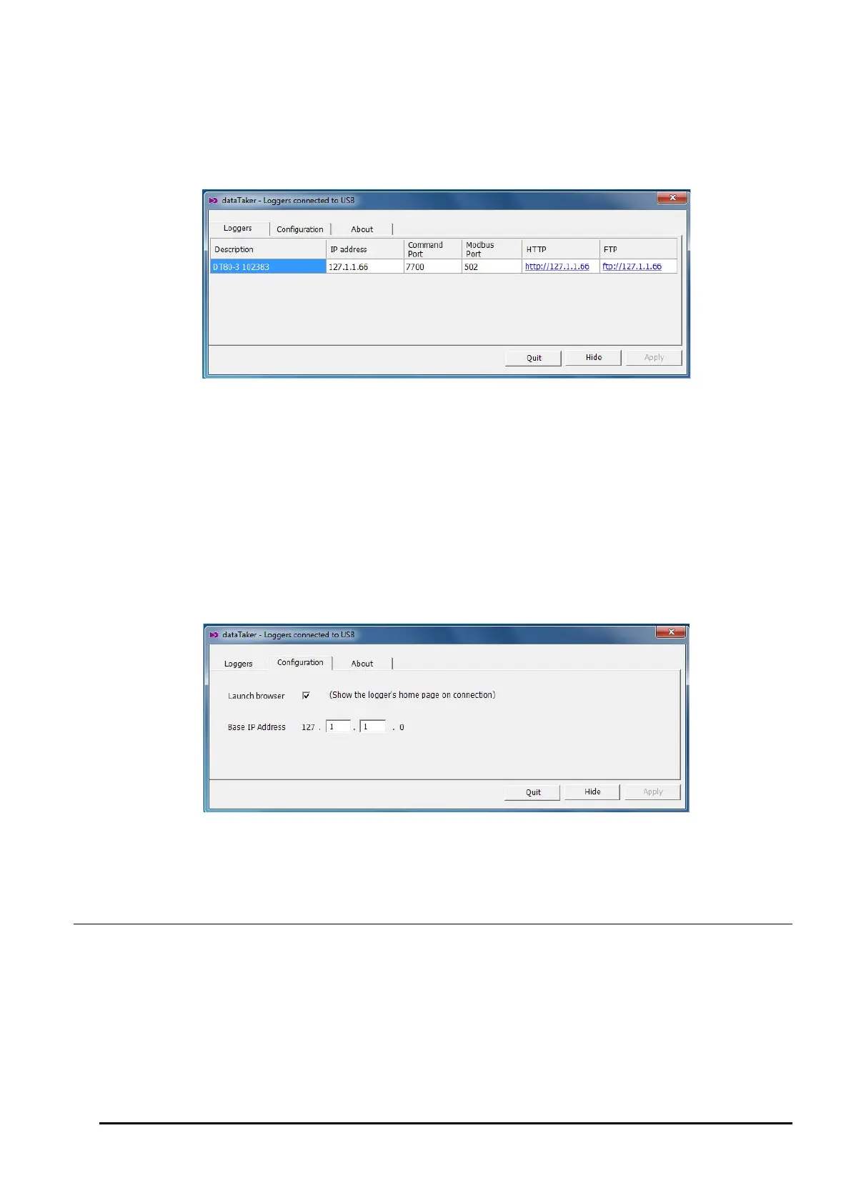 • Quit will terminate DtUsb, which will mean that the logger's TCP/IP services will no longer be available. This