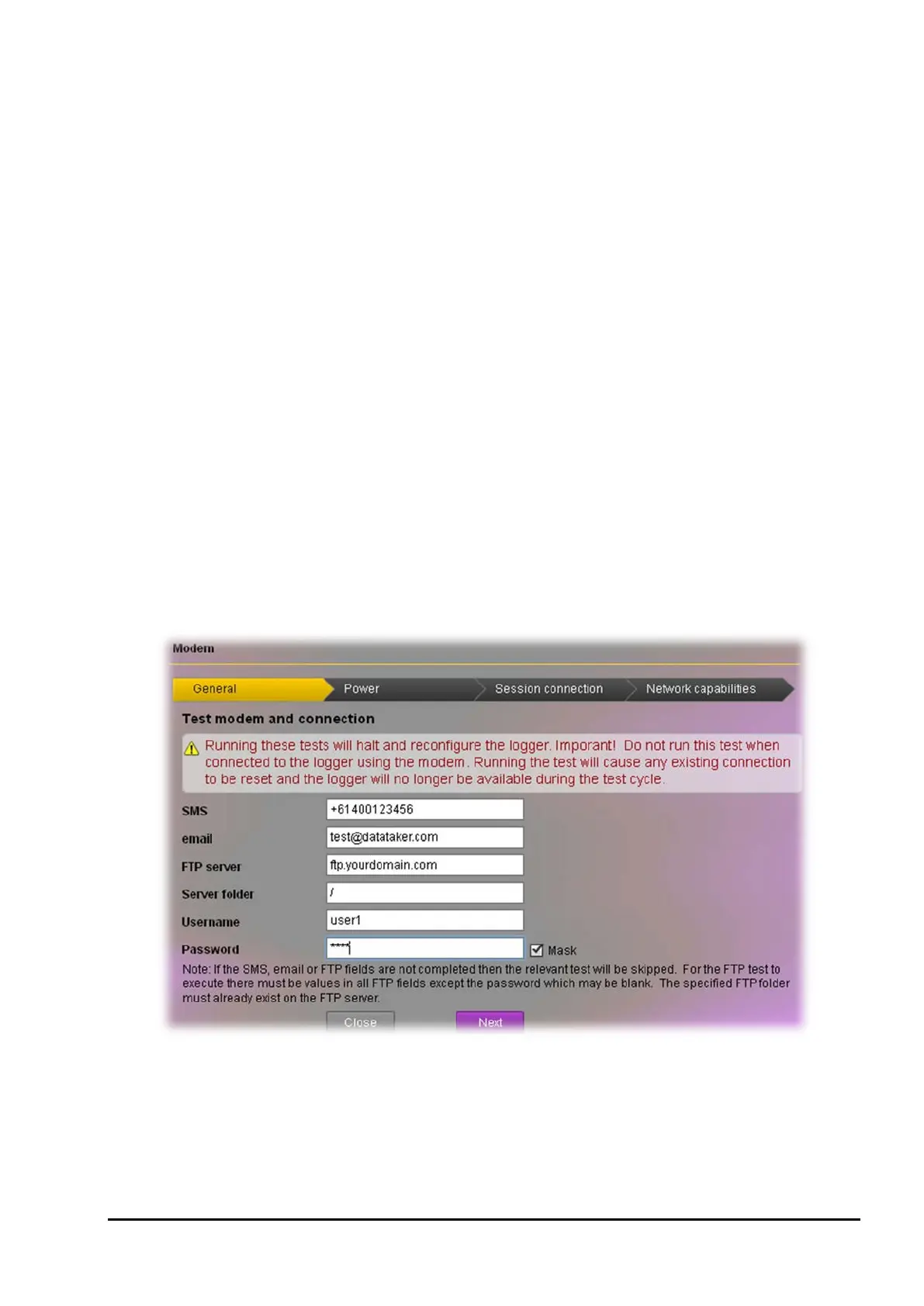 testing SMS), and email address (for receiving a test email) and details of an FTP server (for receiving a test file upload