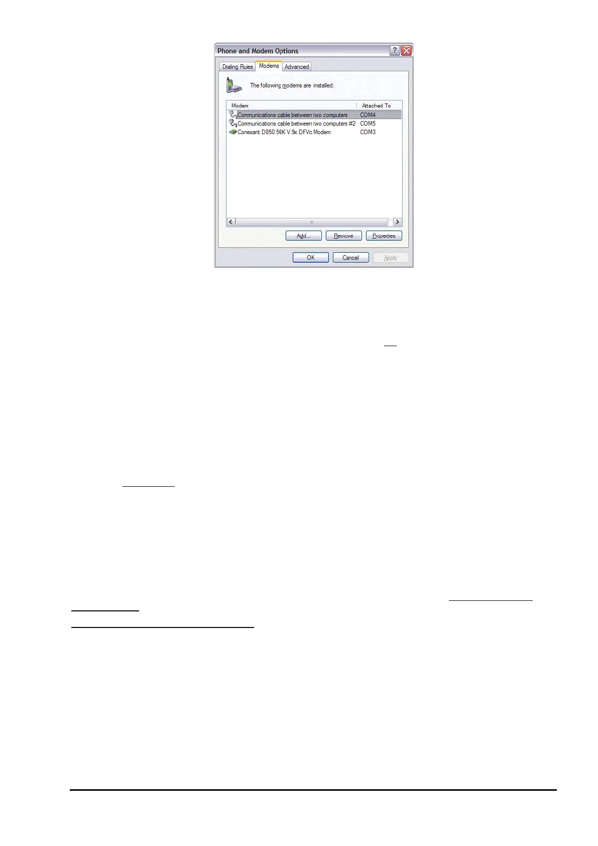 7. Select the appropriate "Communications cable between two computers" modem device from the list.