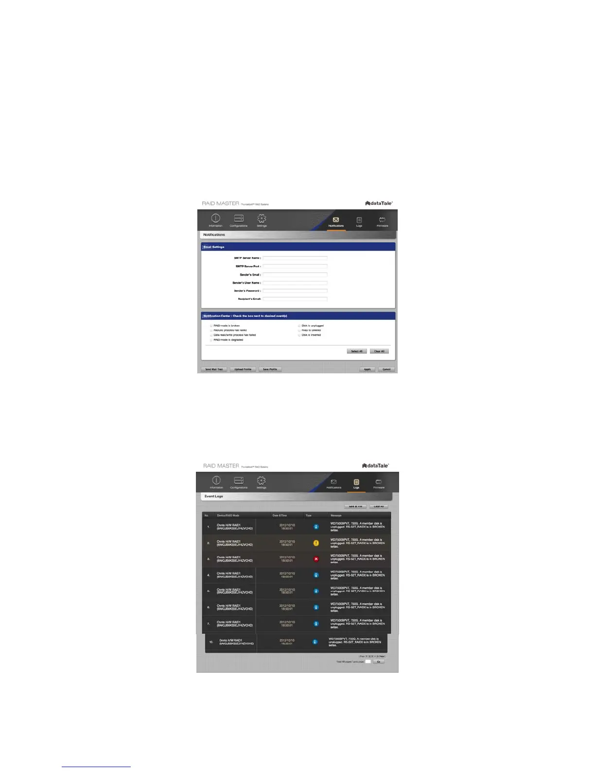 failed, RAID mode is degraded, Disk is unplugged, RAID is deleted, and Disk is