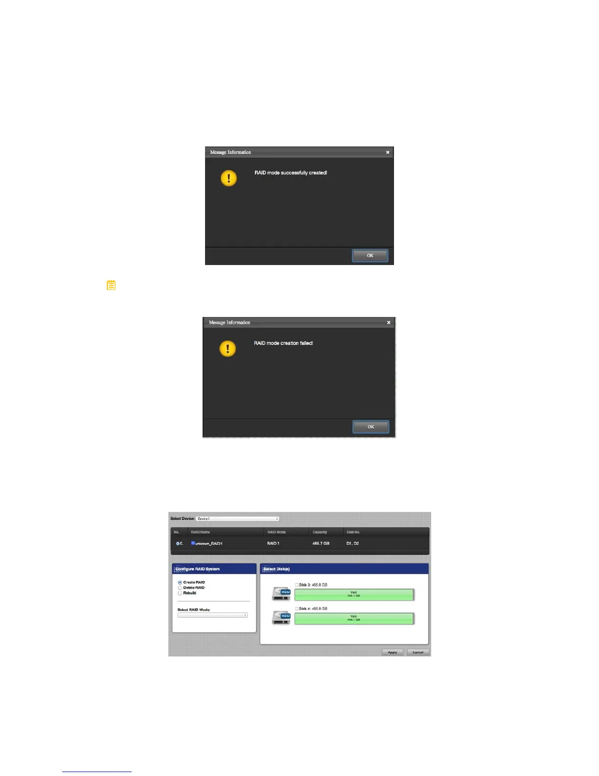 Popup Window stating, “RAID mode creation failed!” Click on the “OK” icon to