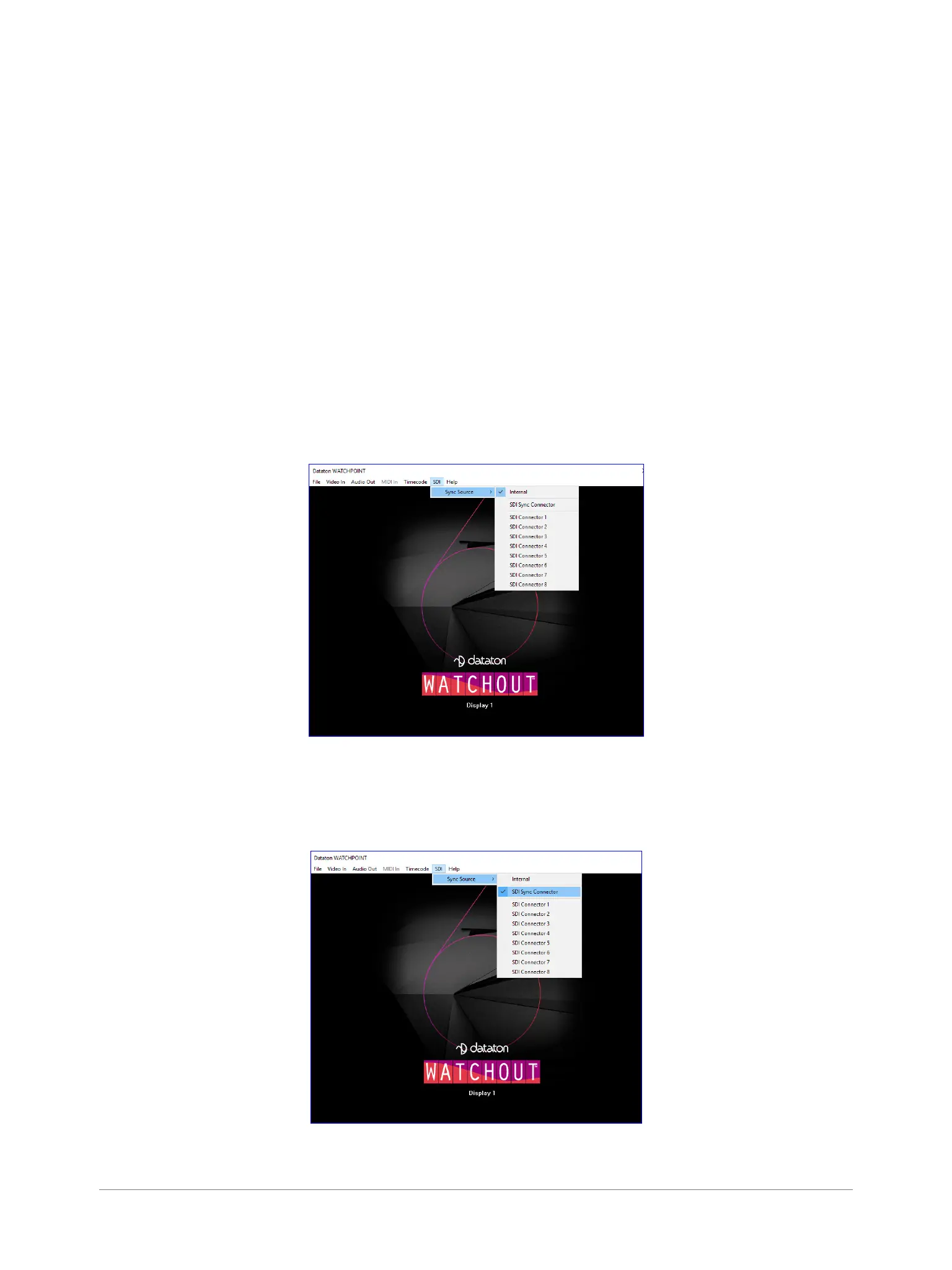 The SDI outputs on your WATCHPAX 60 can be synchronized in three ways, or modes, as listed