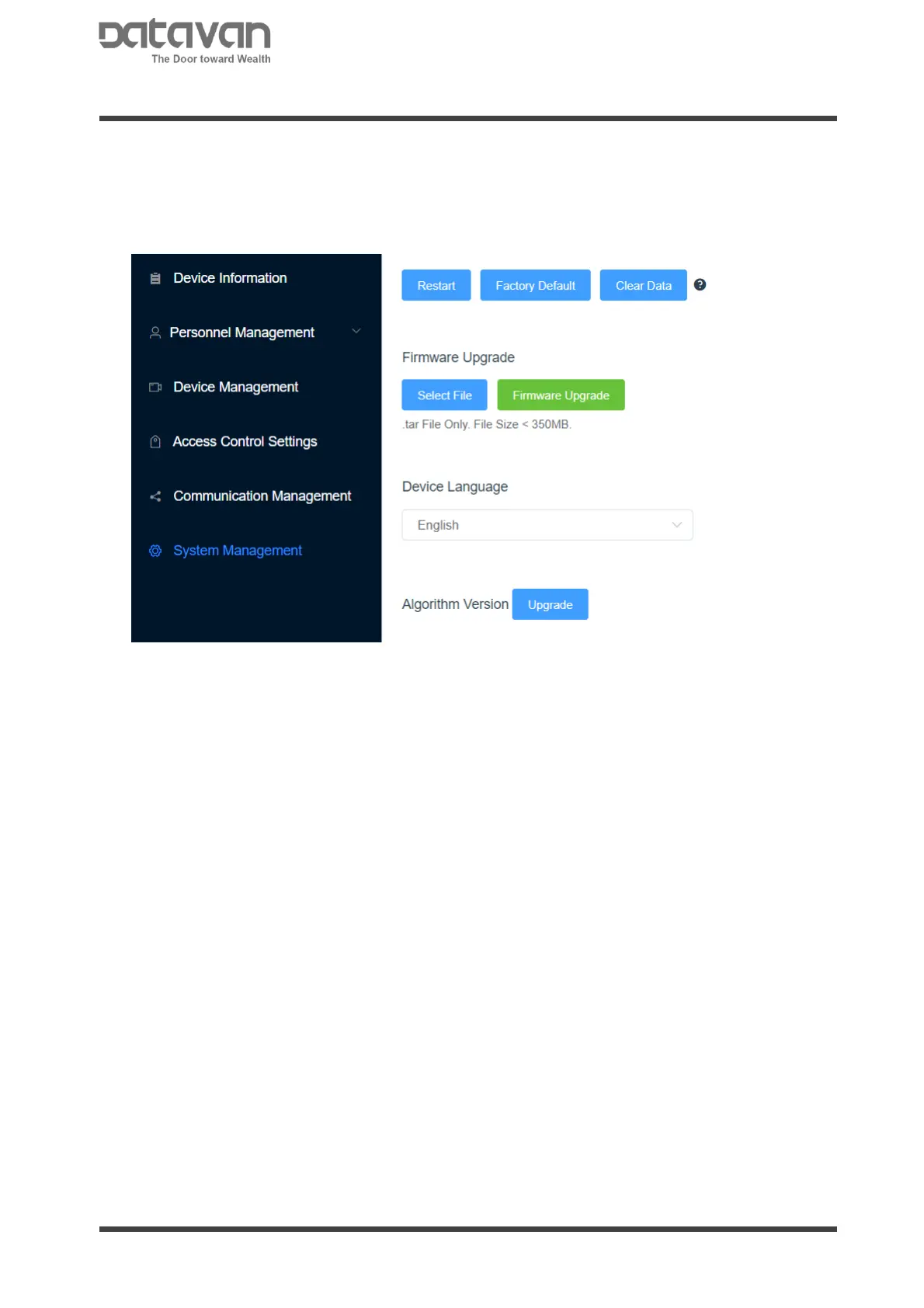 Upload device firmware. Click [Select File] to select firmware file which is in (.tar).
