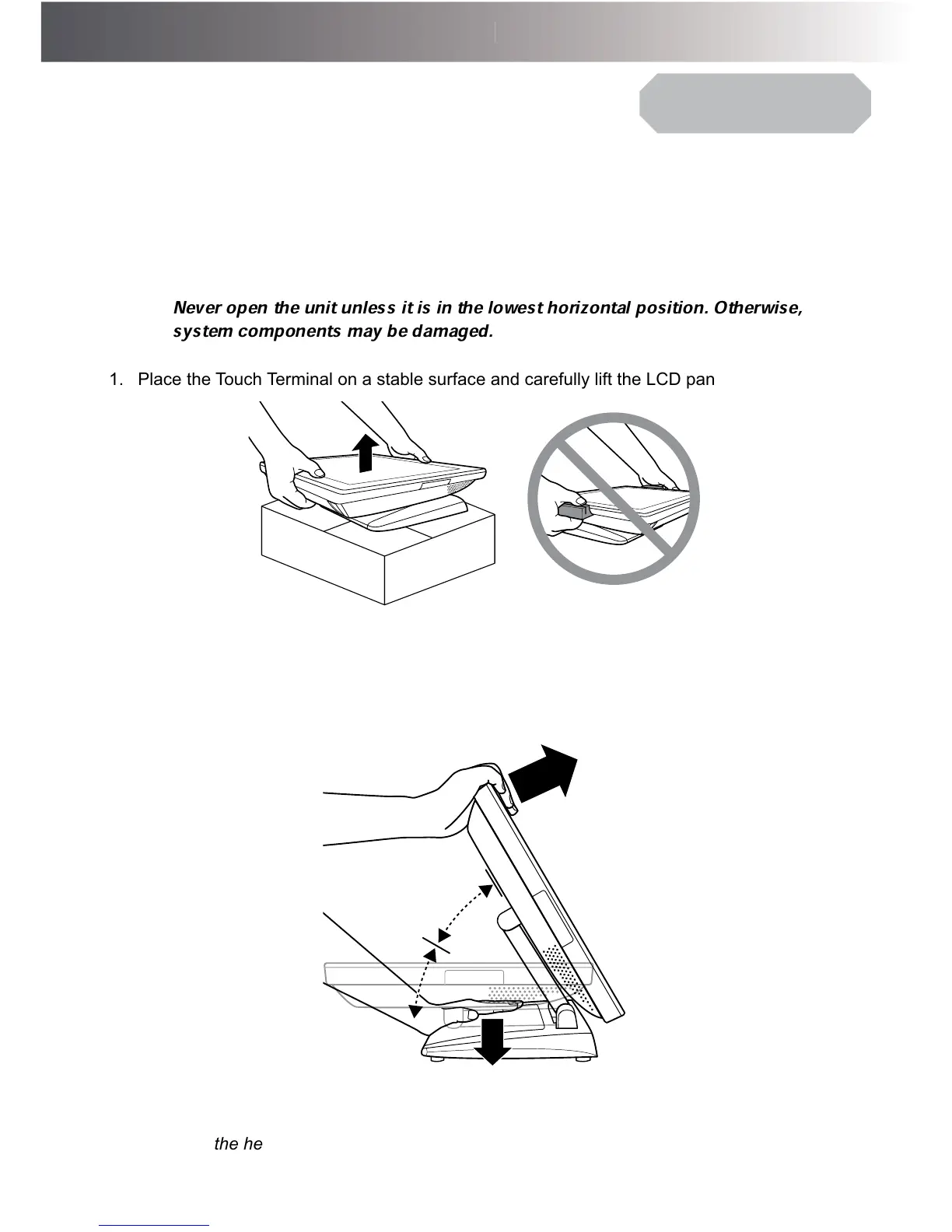 1. Place the Touch Terminal on a stable surface and carefully lift the LCD panel.