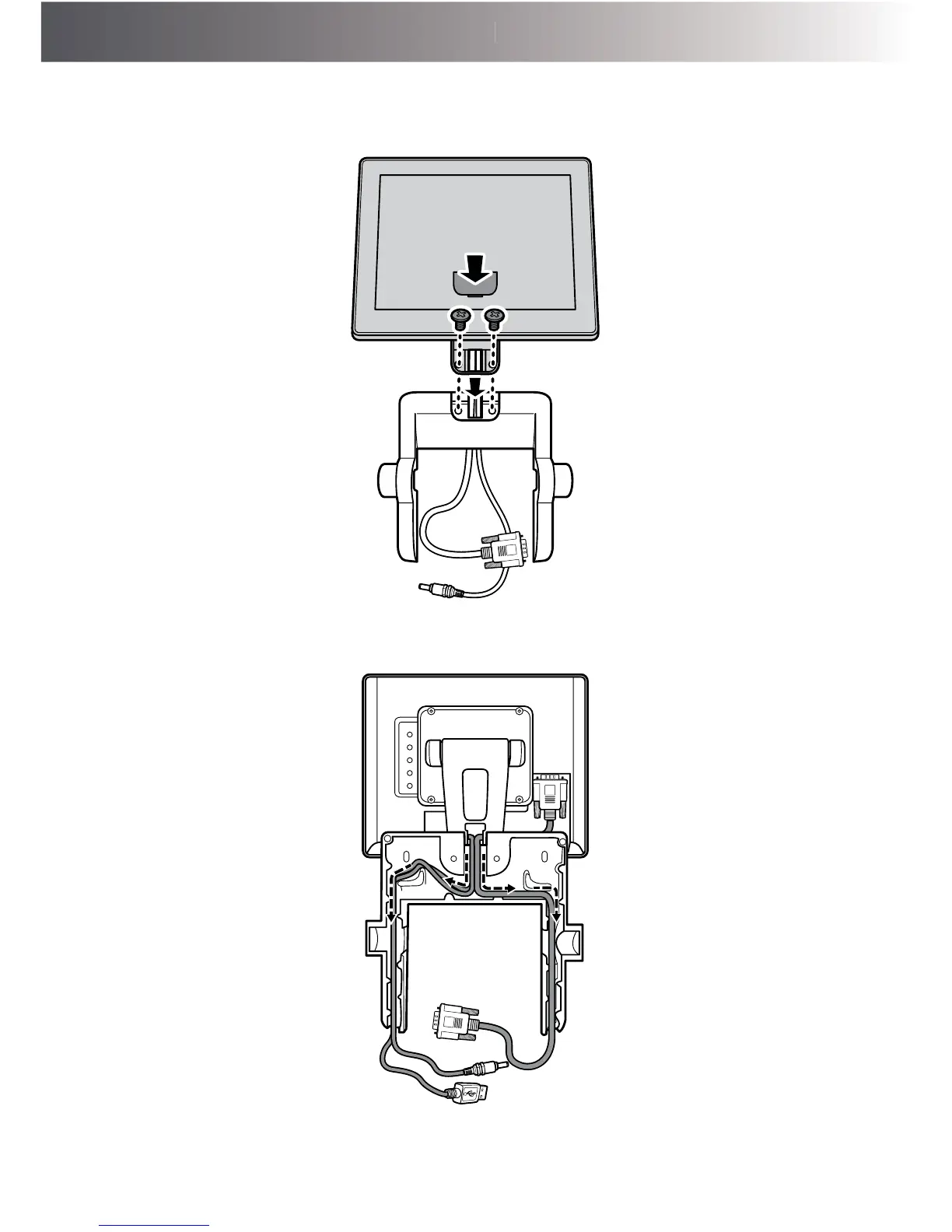 5. Route the secondary LCD display’s power cable, VGA cable, and Touch USB cable
