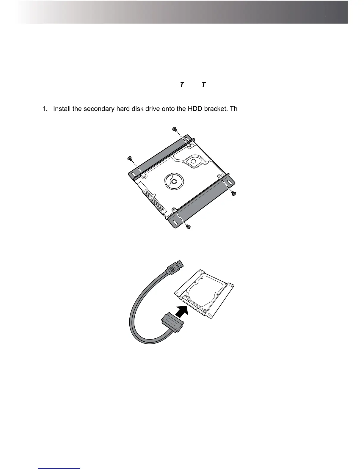 1. Install the secondary hard disk drive onto the HDD bracket. Then secure it with the four