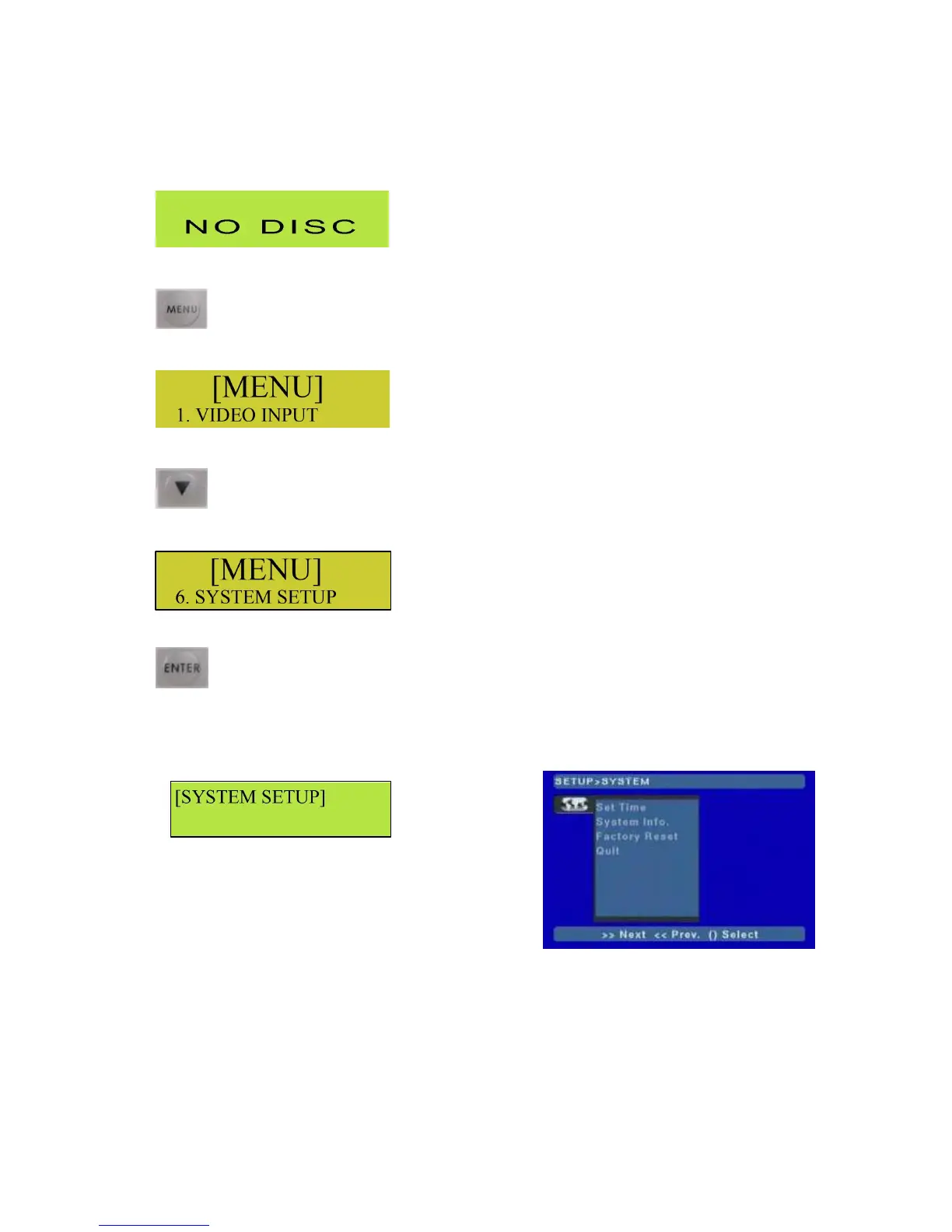 TheLCDDisplayshouldnowreadSystemSetup,andontheTVmonitortheSetupoptionsshouldbe