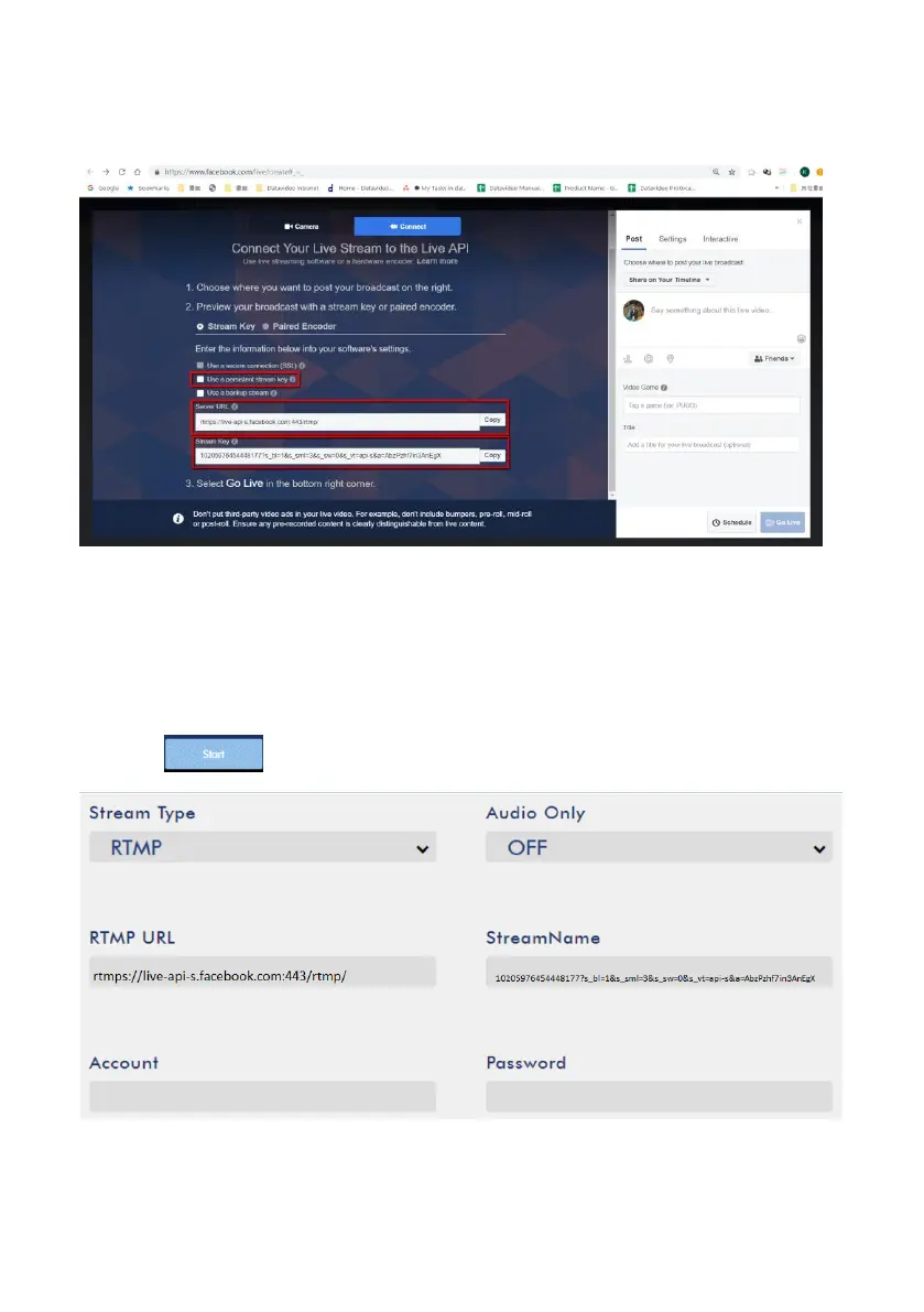 “Stream Key” that are copied from the Facebook streaming page into the “RTMP