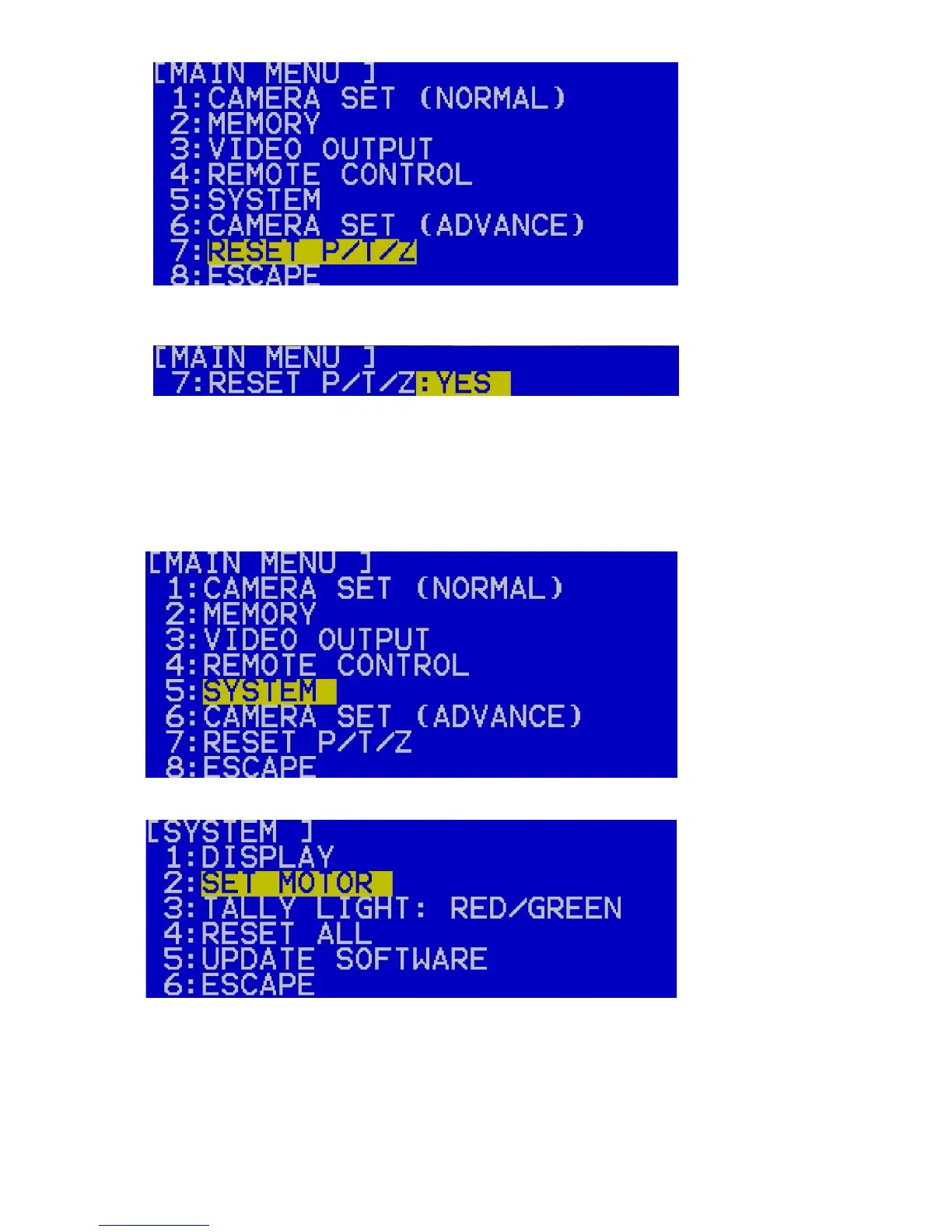 Once in option 7, select YES to reset PAN, TILT and ZOOM values to factory defaults.