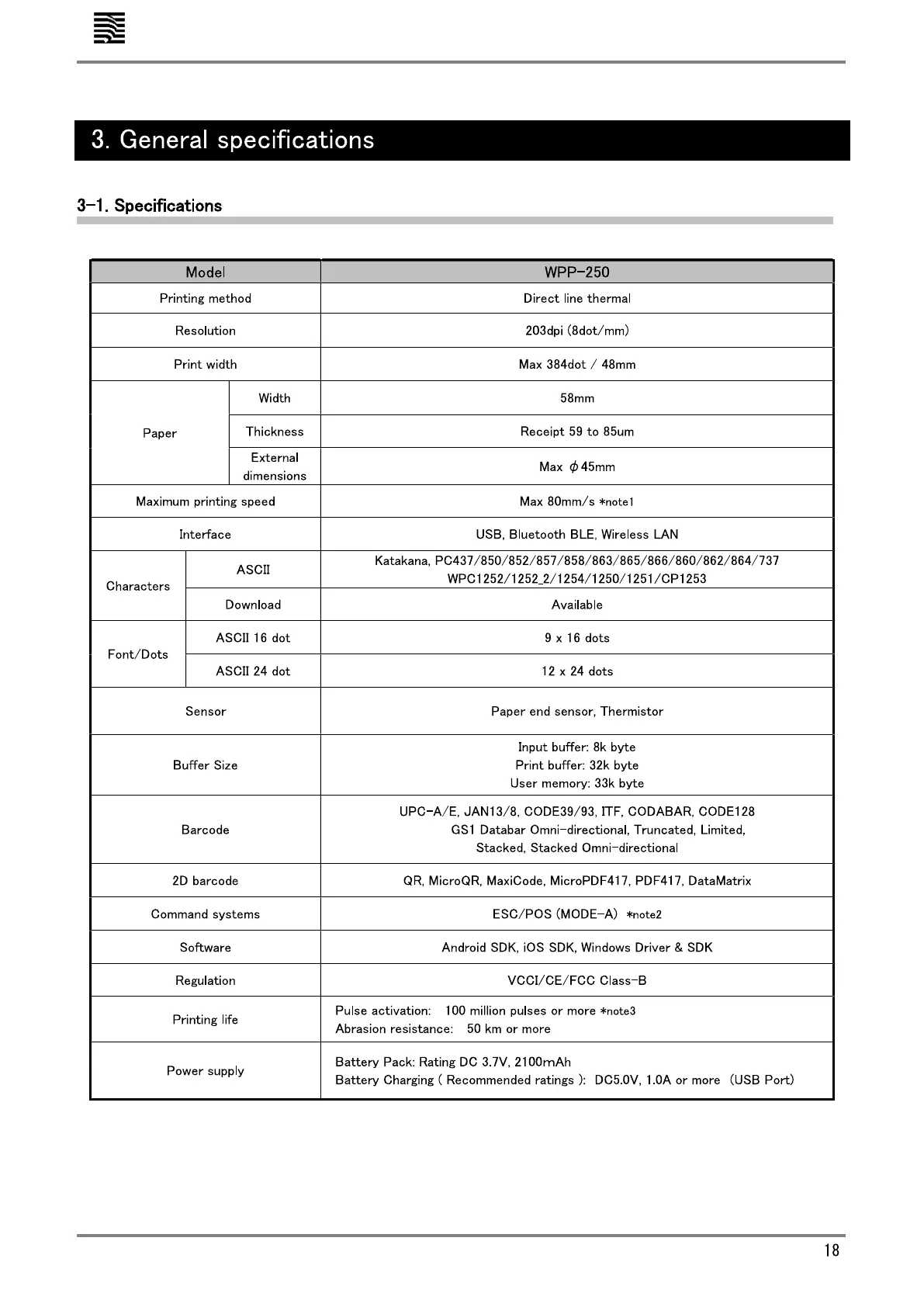 Datecs WPP-250 - 3. General Specifications; 3-1. Specifications