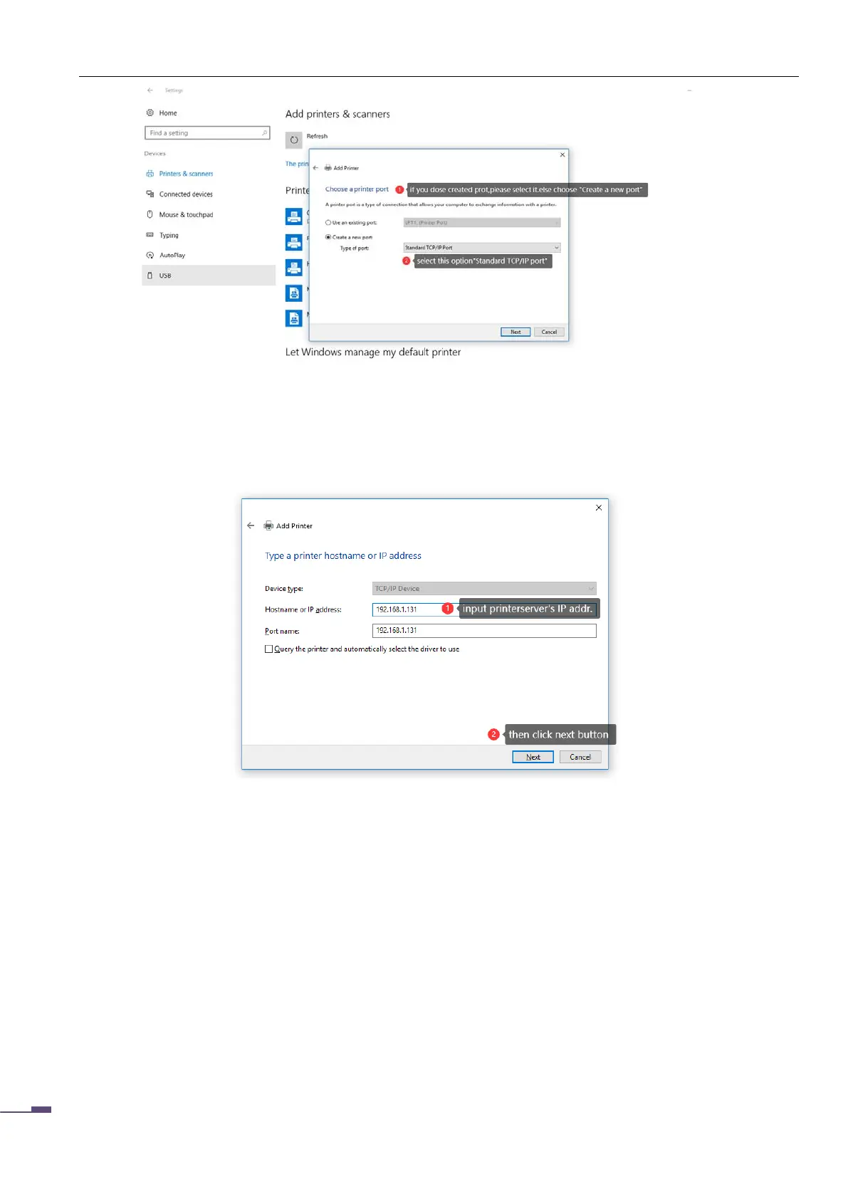 In this window, enter the IP address of the print server, the port name (optional), and uncheck "Query the