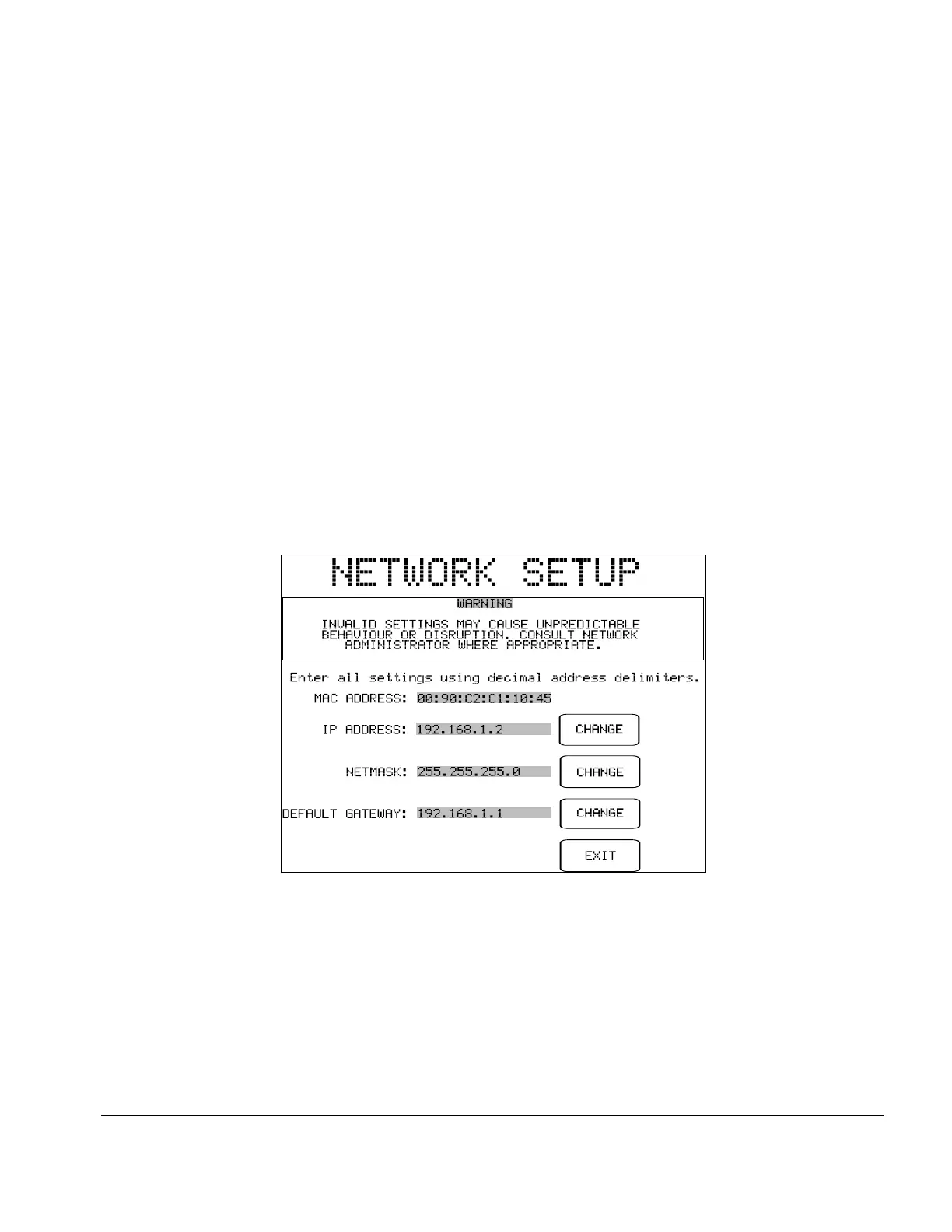 Allows the user to input Ethernet settings (IP address, netmask, and