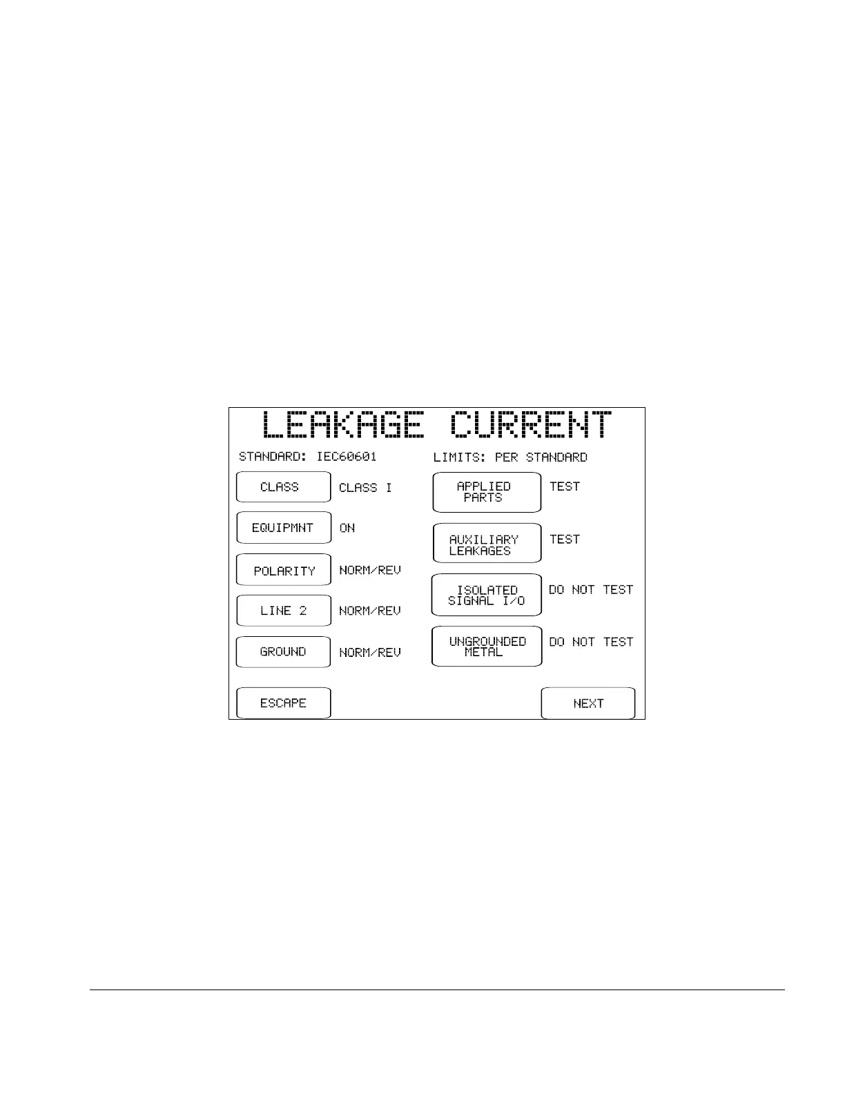 Fig u re 9 - Leakage current menu for IEC60601 standard.