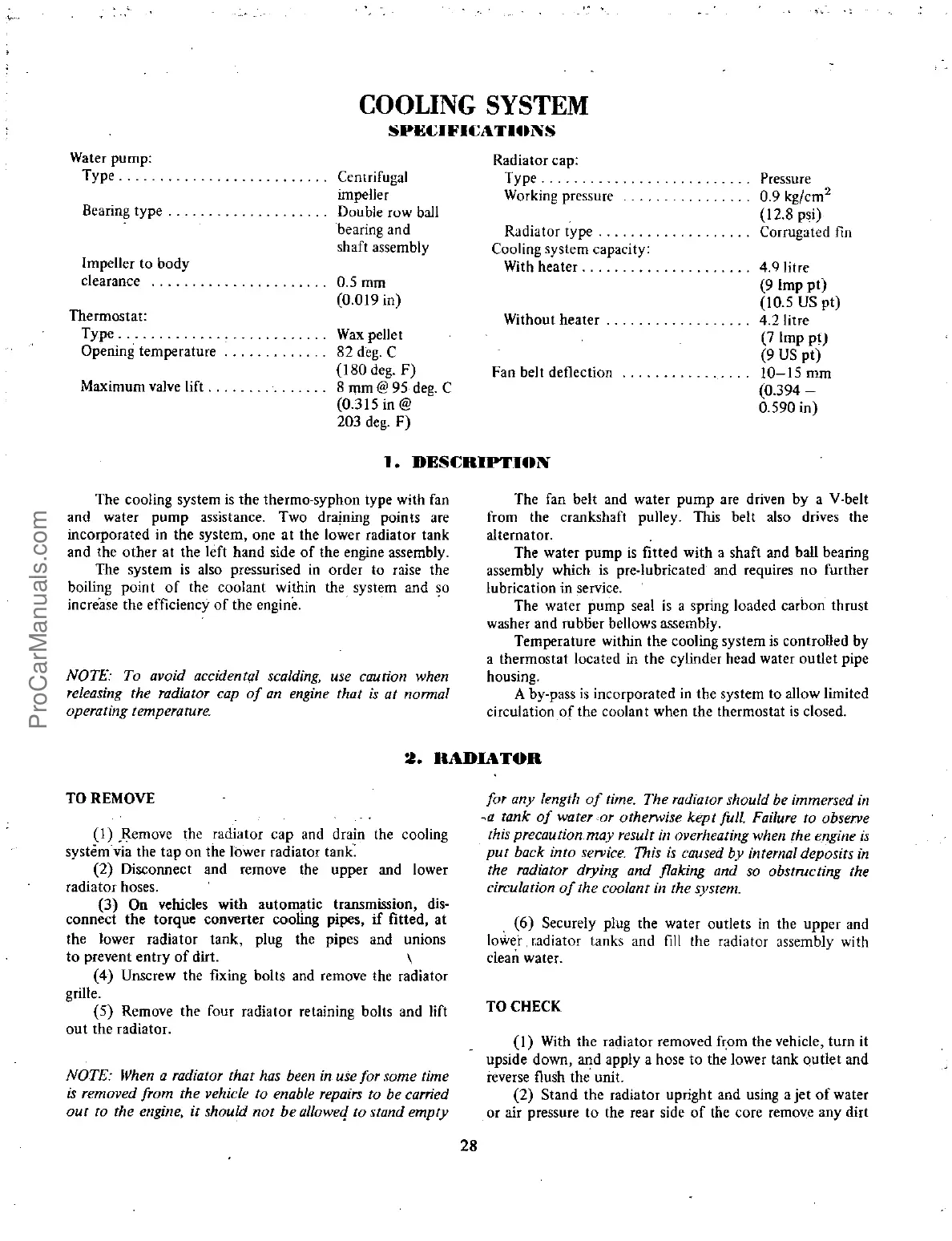 Datsun 1000 - COOLING SYSTEM; SPECIFICATIONS; DESCRIPTION; RADIATOR