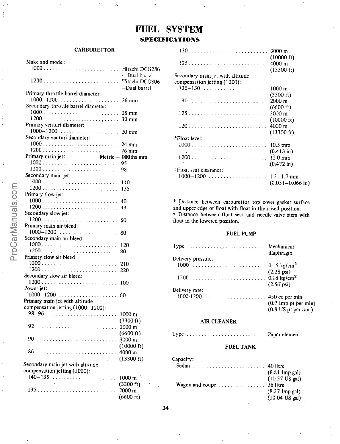 Datsun 1200 - FUEL SYSTEM; FUEL SYSTEM SPECIFICATIONS
