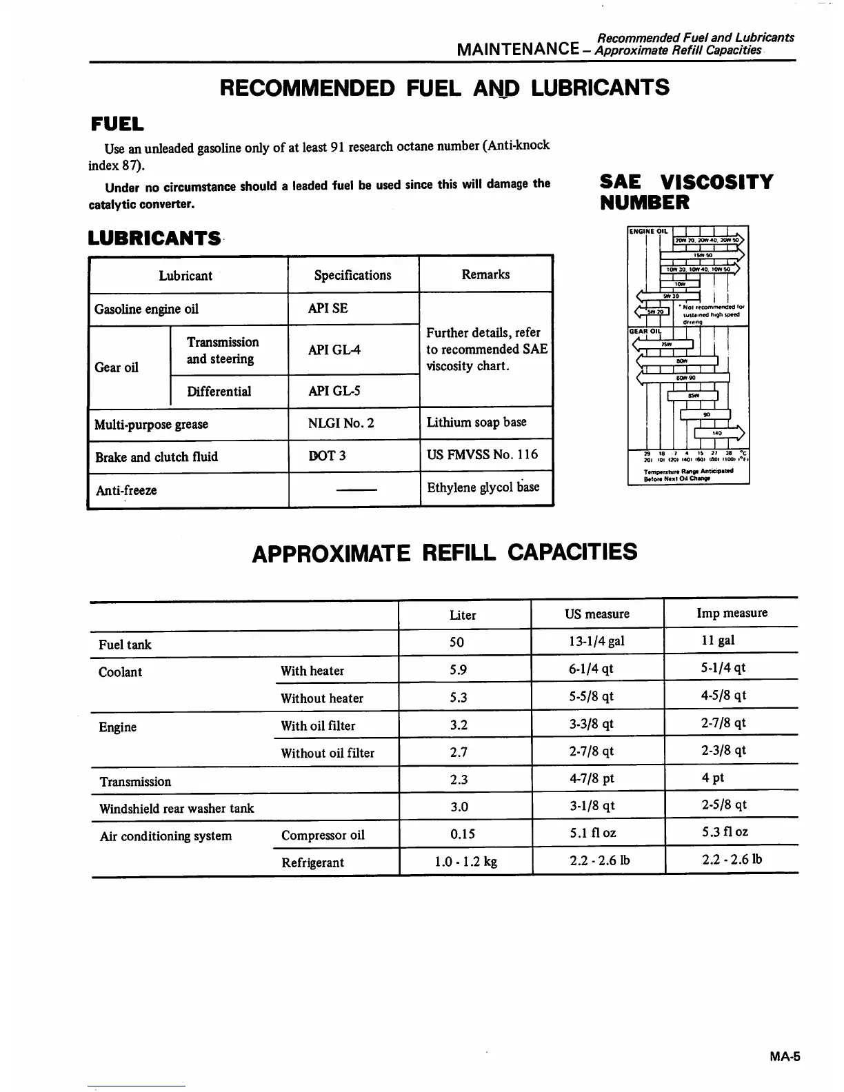 Datsun 1980 310 - Recommended Fuel and Lubricants; SAE Viscosity Number; Approximate Refill Capacities