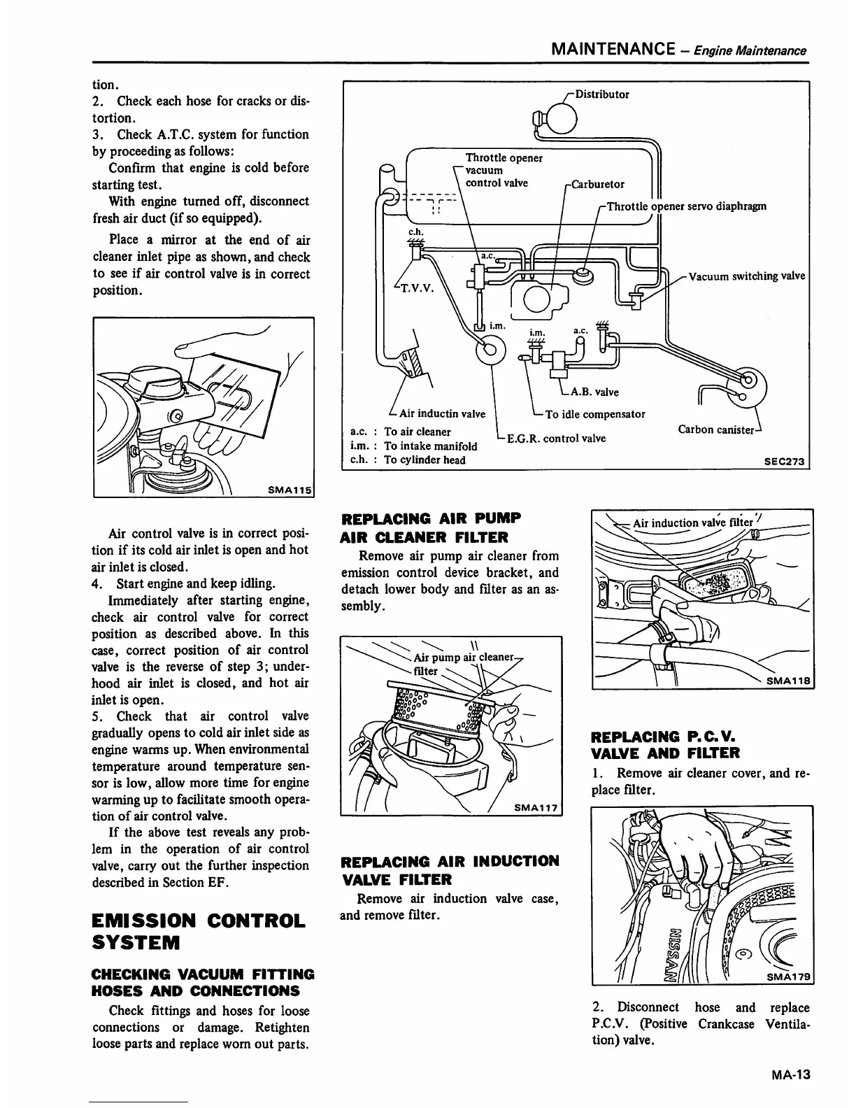 Datsun 1980 310 - Emission Control System; Replacing Air Induction Valve Filter; Replacing P.C.V. Valve and Filter