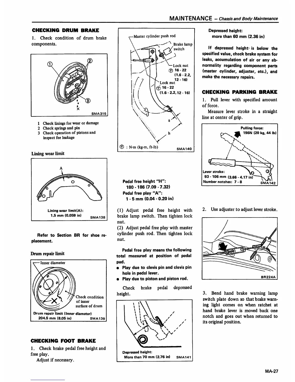 Datsun 1980 310 - Checking Drum Brake; Checking Parking Brake; Lining Wear Limit; Drum Repair Limit