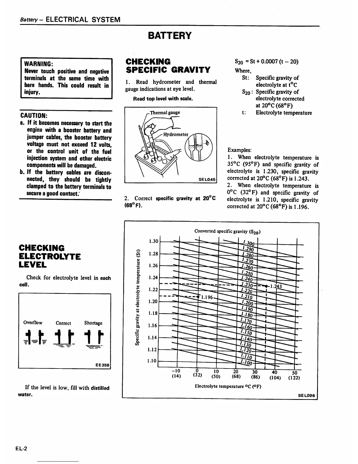 Datsun 1980 310 - Battery; Checking Specific Gravity; Checking Electrolyte Level