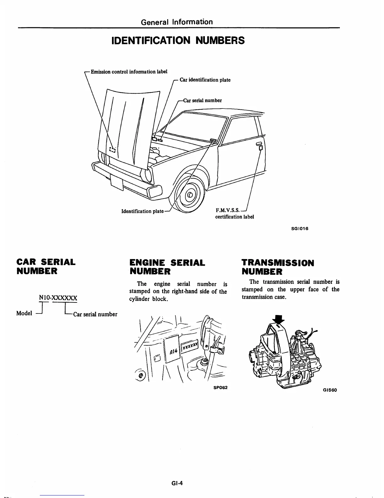 Datsun 1980 310 - Identification Numbers; Car Serial Number; Engine Serial Number; Transmission Number