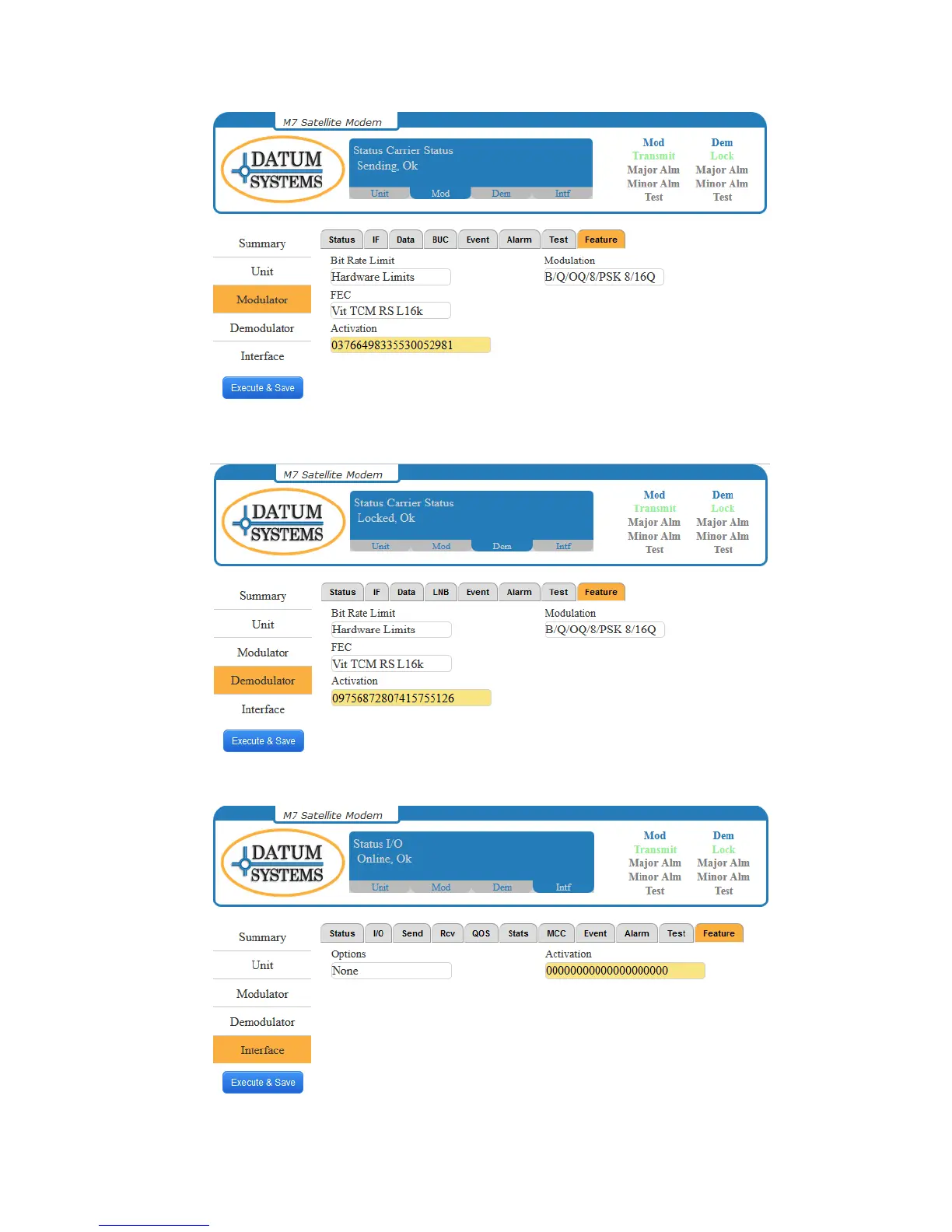 Datum Systems M7LT Series - Figure 4-3 - Modulator Feature Page; Figure 4-4 - Demodulator Feature Page; Figure 4-5 - E7 Interface Feature Page
