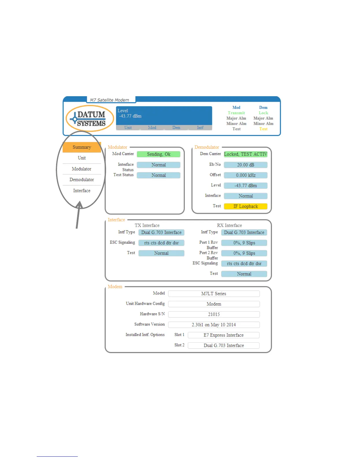 From the Summary Status page, the user may navigate to the other modem card set pages by