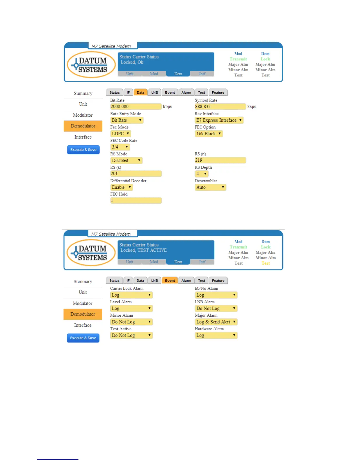 Datum Systems M7LT Series - Figure 3-19 - Demodulator Data Interface Page; Figure 3-20 - Demodulator Event Page