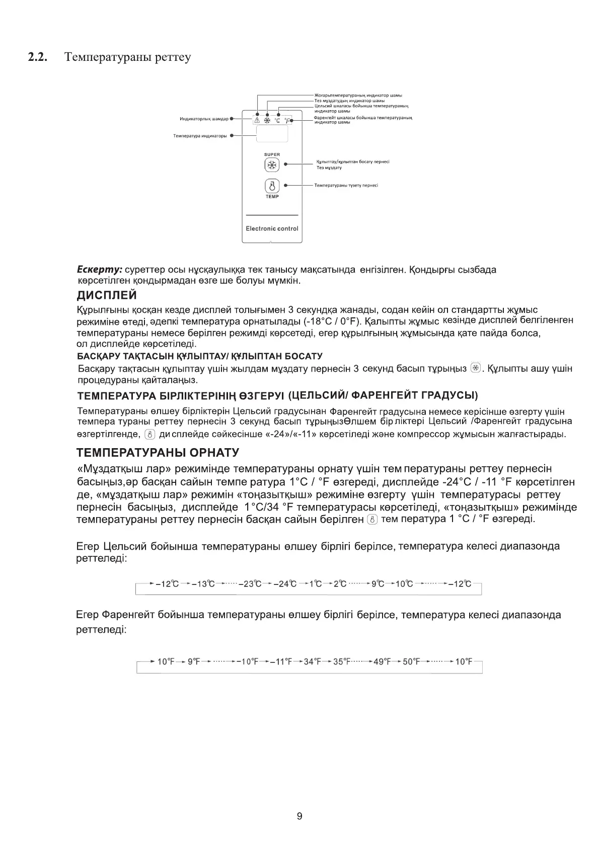 дисплеї відобразиться -24°C / -11°F, знову натисніть клавішу коригування температури для