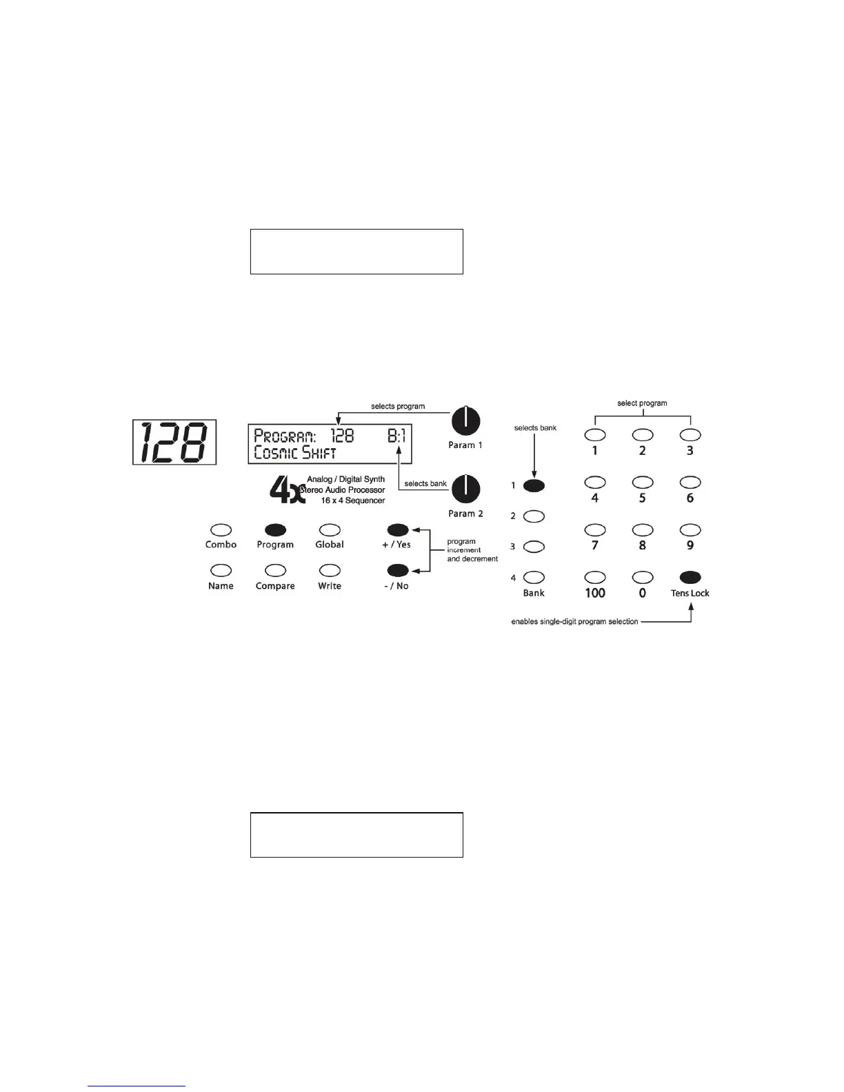 The top line shows the Program (1…128) and Bank (1…4) number of the currently