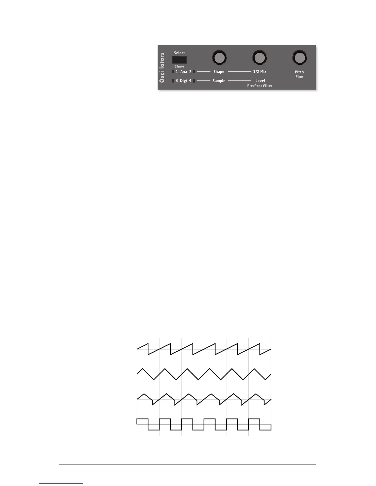 Oscillators 3 and 4 are digital and generate various sample-based sounds, includ
