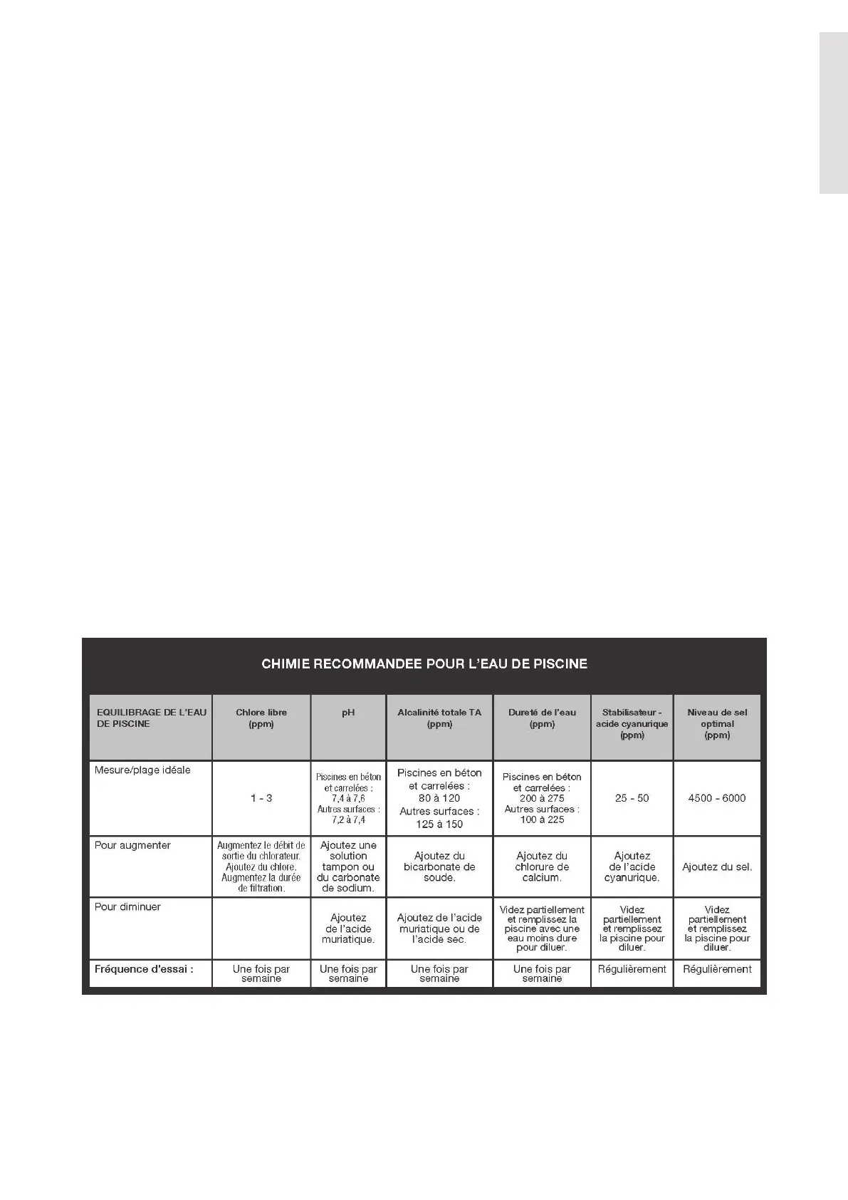 production de chlore suffisante, votre piscine ne pourra jamais fonctionner correctement. TOUJOURS FAIRE