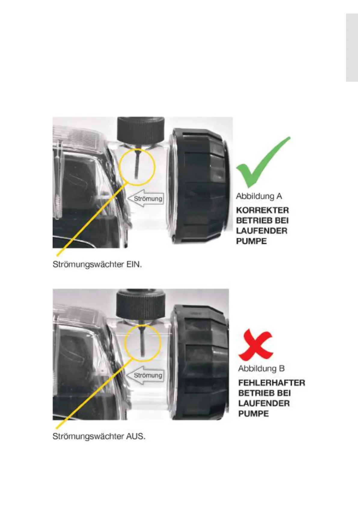 • Überprüfen Sie regelmäßig, ob das Paddel des Sicherheits-Strömungswächters sich auch vor- und