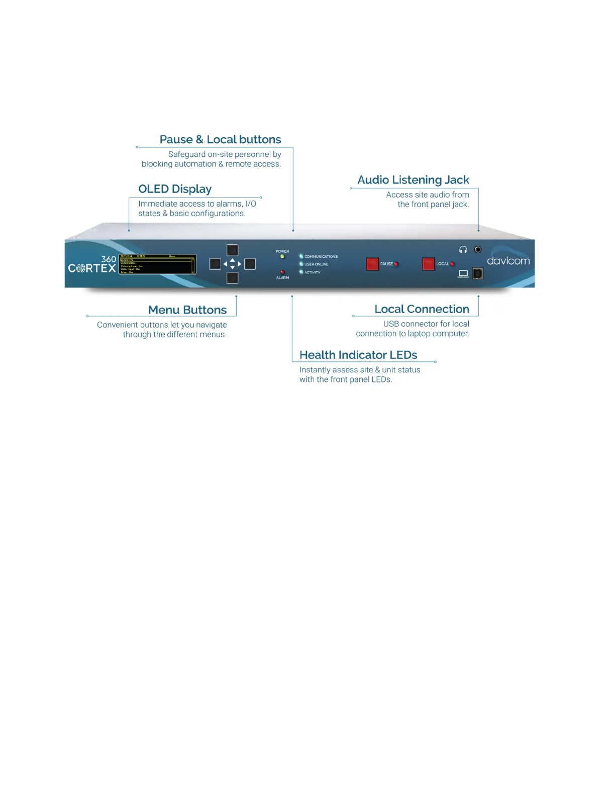 The Cortex front panel provides easily accessible site and equipment-status information without requiring the use of a