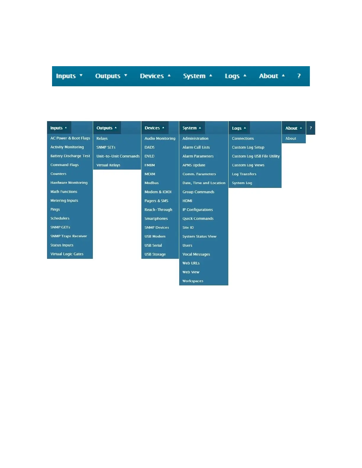 Each of the 6 top menu categories gives access to visualization screens for: Inputs, Outputs, Devices, System, Logs,