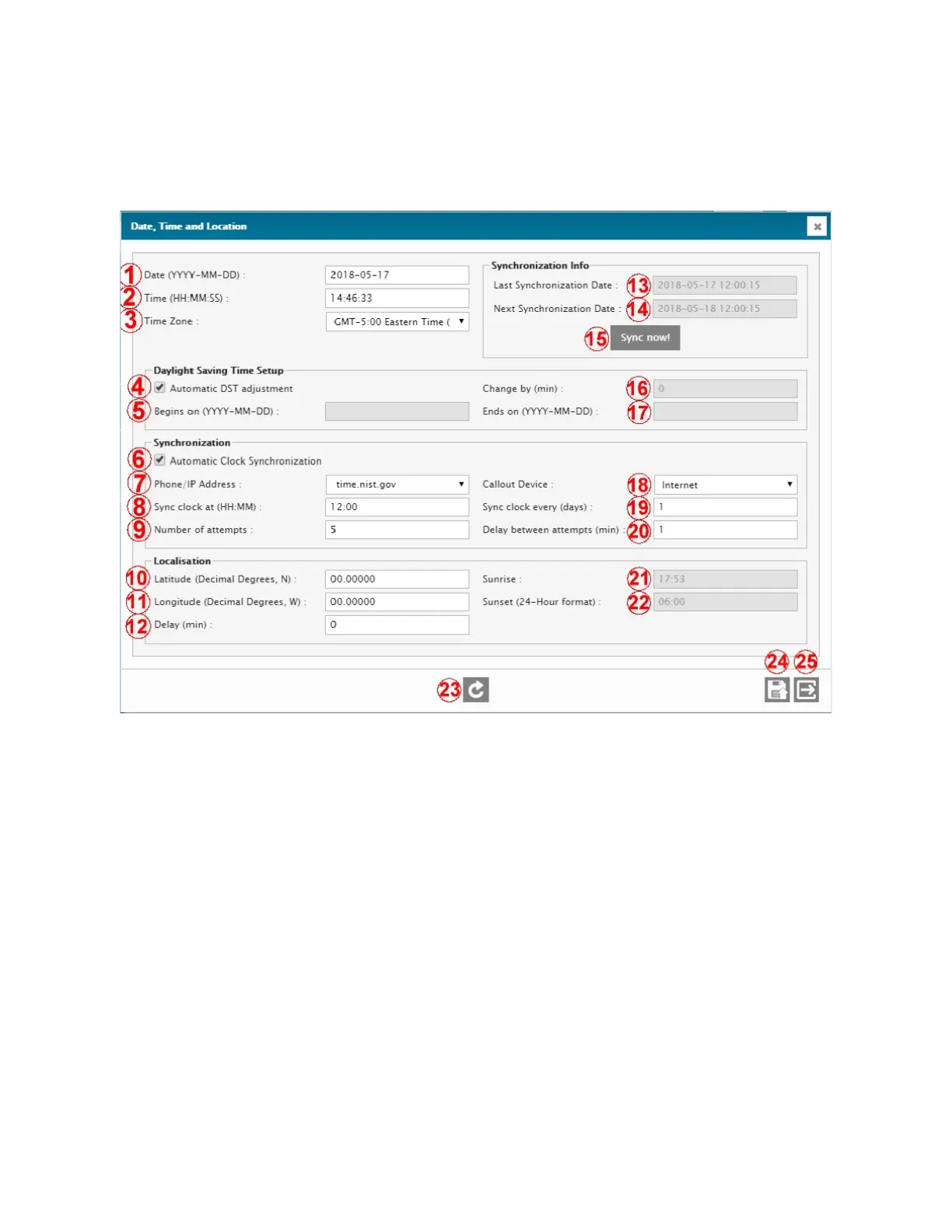 This screen contains all the settings that relate to time, time-zone, date, and location of the unit.