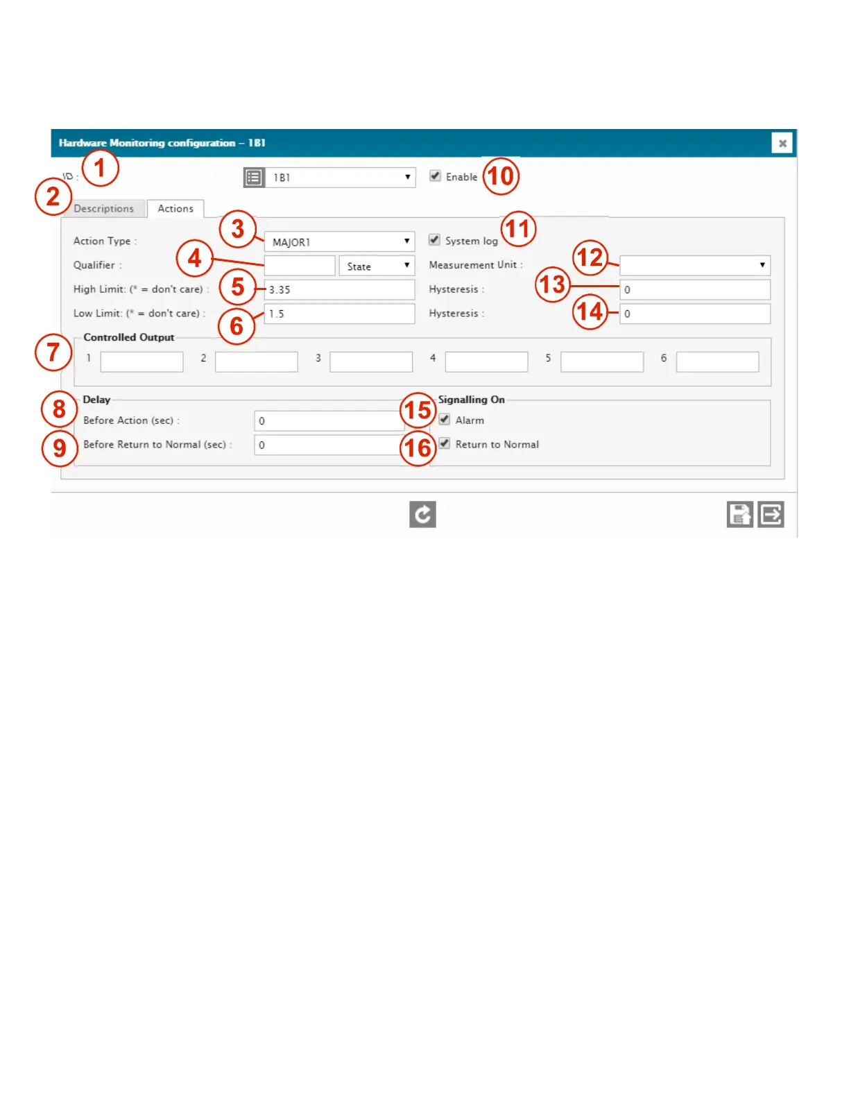 Selects the action type that will happen when an out-of-limit condition occurs. 3 types are available: Major alarm,