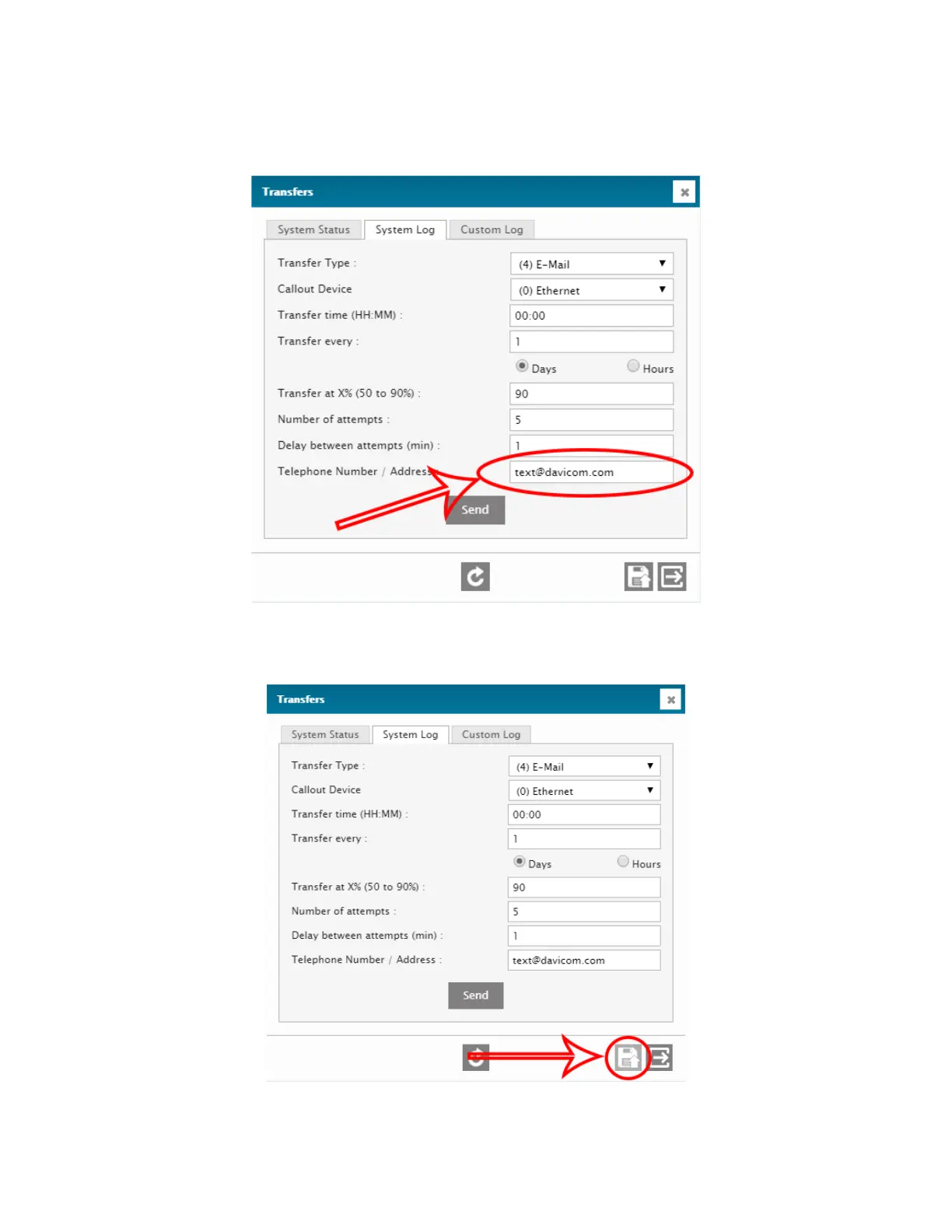 19. Enter the phone number, email, etc. to which the System Log report will be sent.