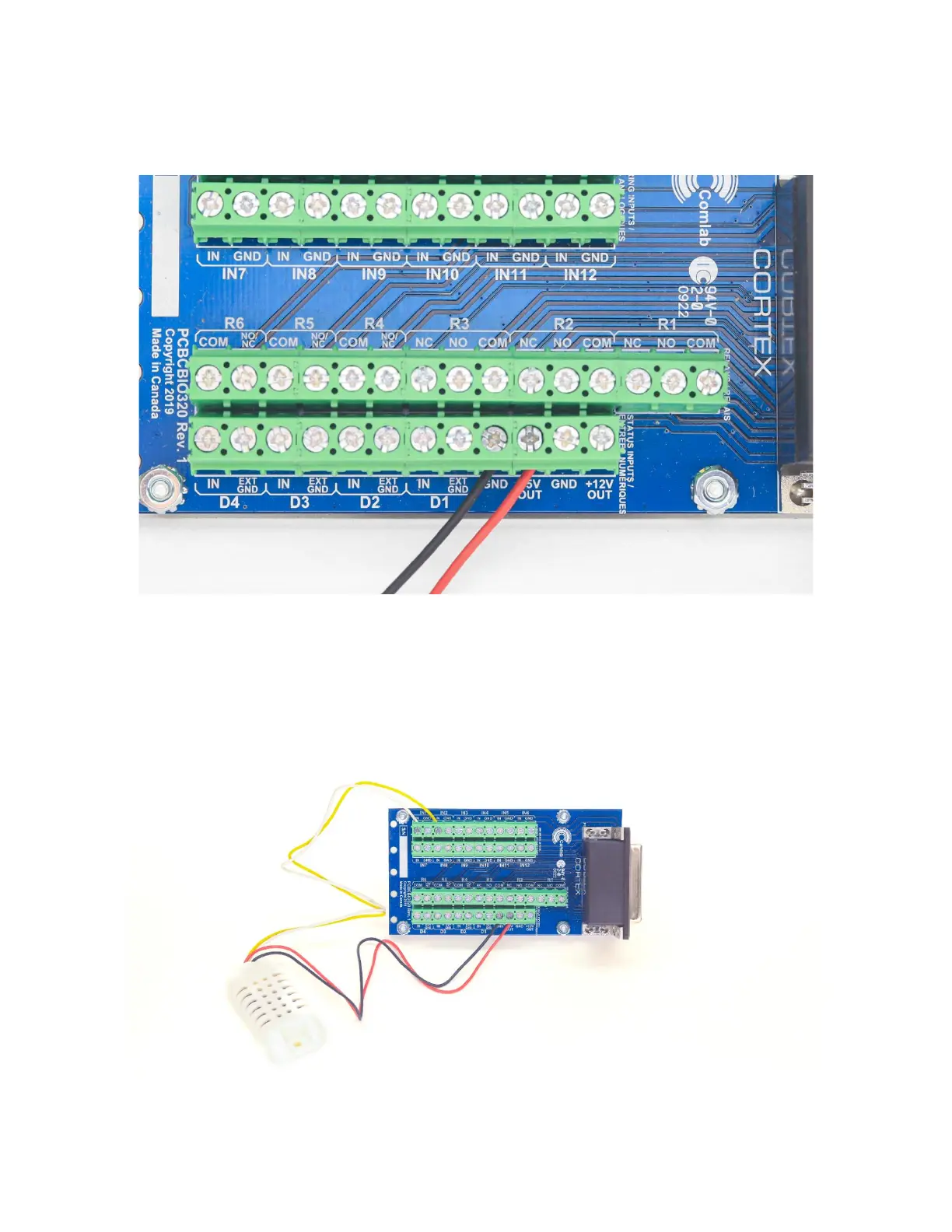 6. Insert the red wire into the +5V OUT at the bottom right of the board and screw it