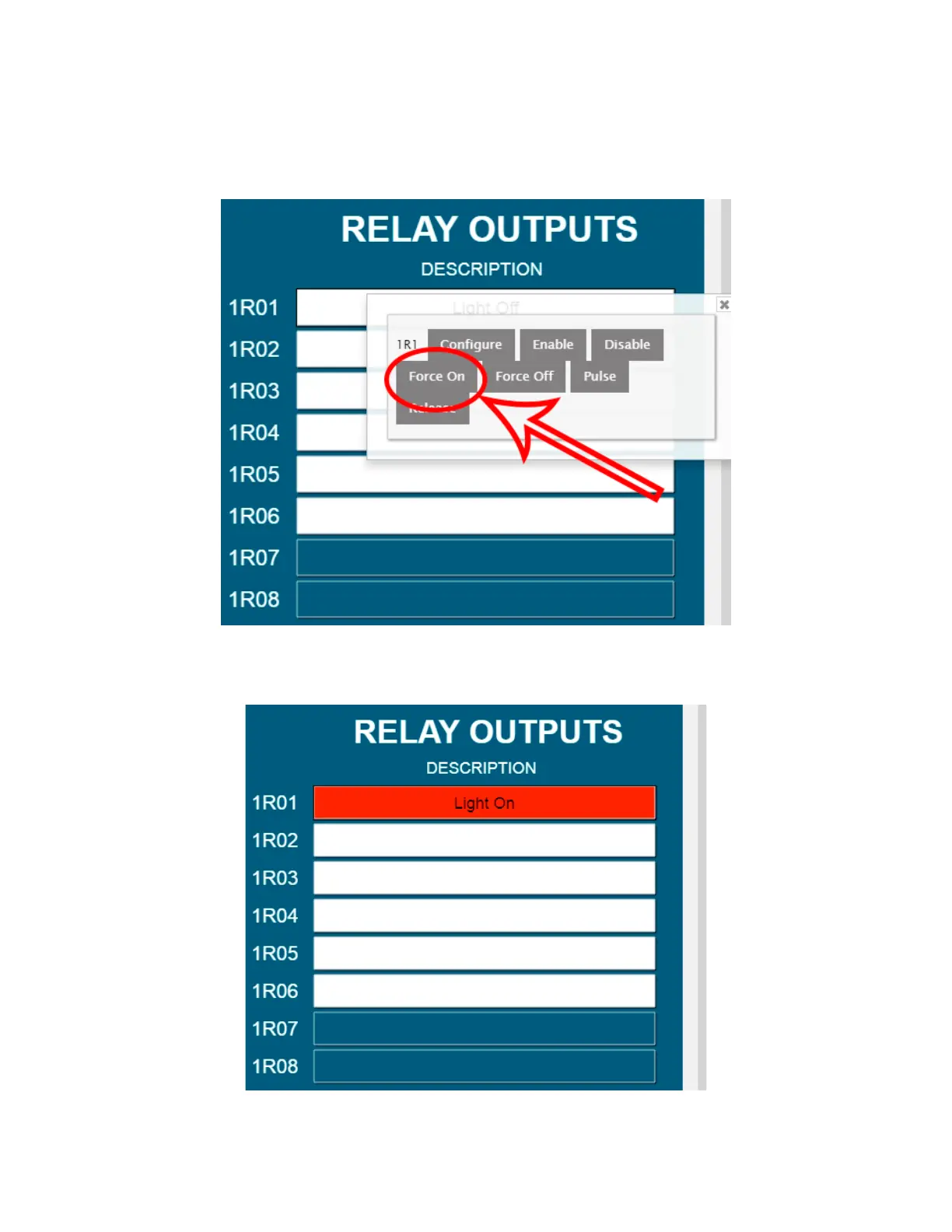 3. To force on the relay, click