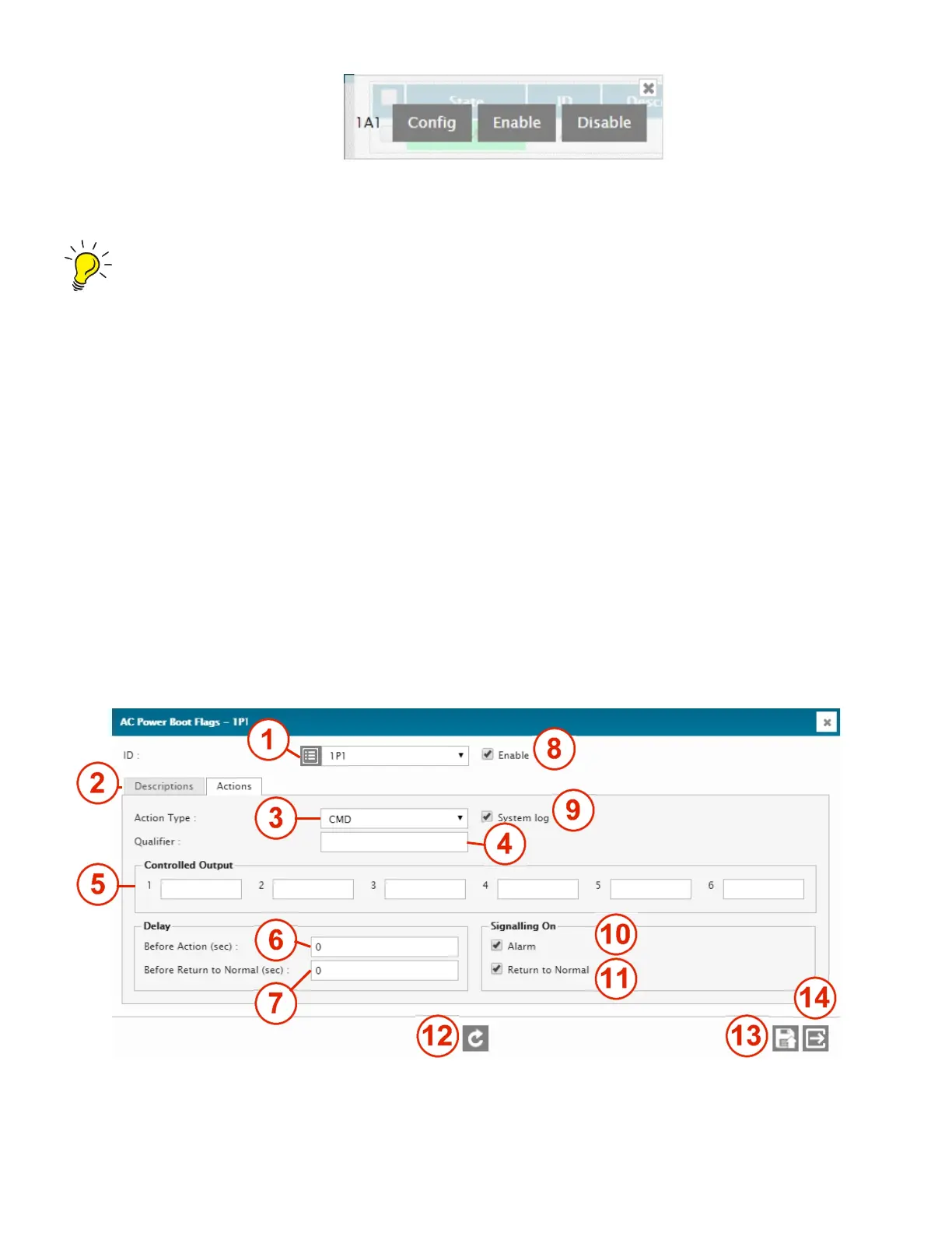 Below is the Actions menu screen of the AC Power Fail input.