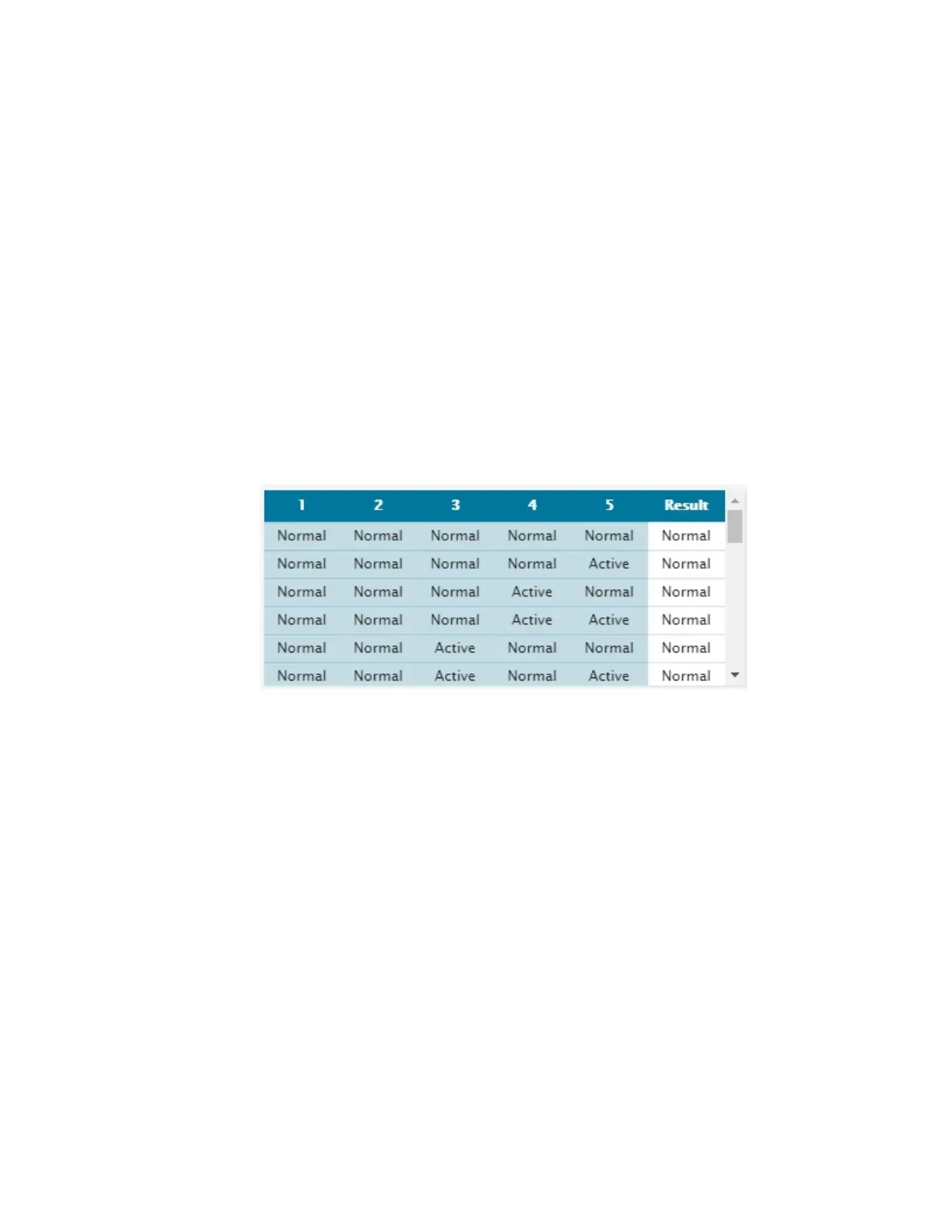Dynamic table showing the logic state (Result) of the VLG for every possible condition of its operands (1 to 5).