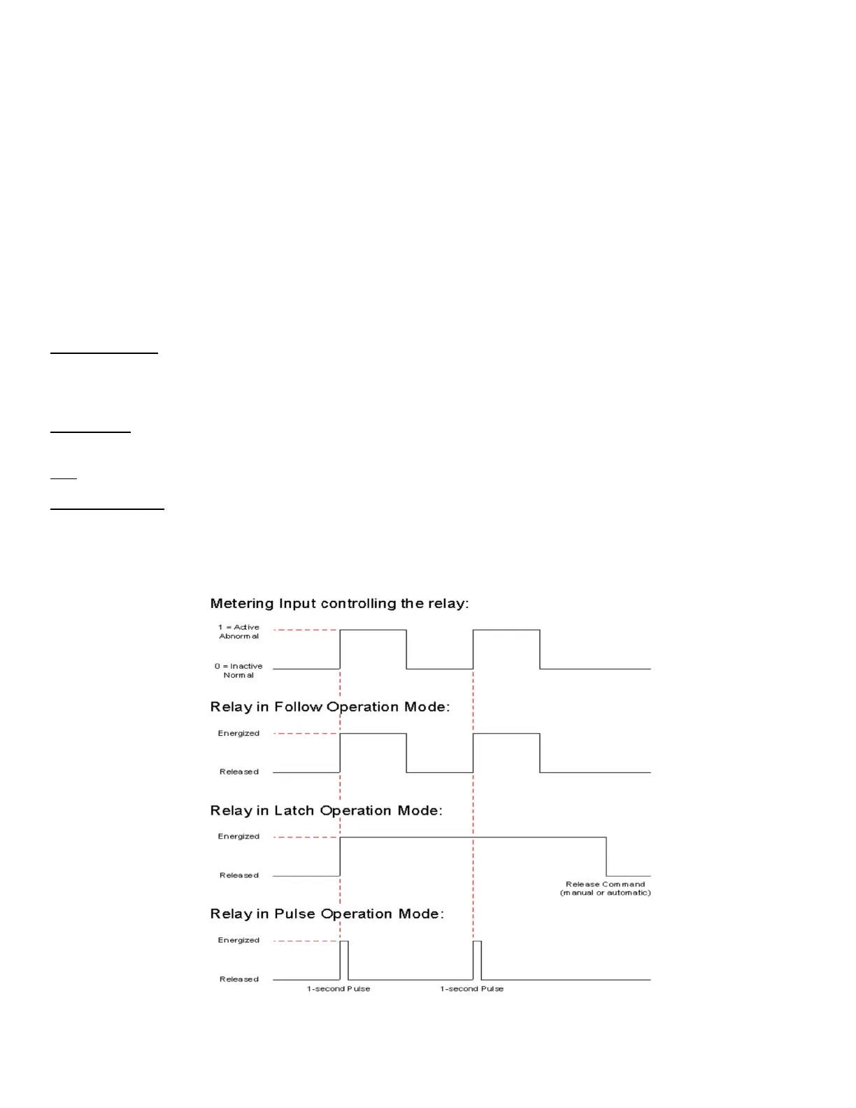 This operating mode only allows a relay to pulse. It will pulse for the time duration set in its configuration menu. Default