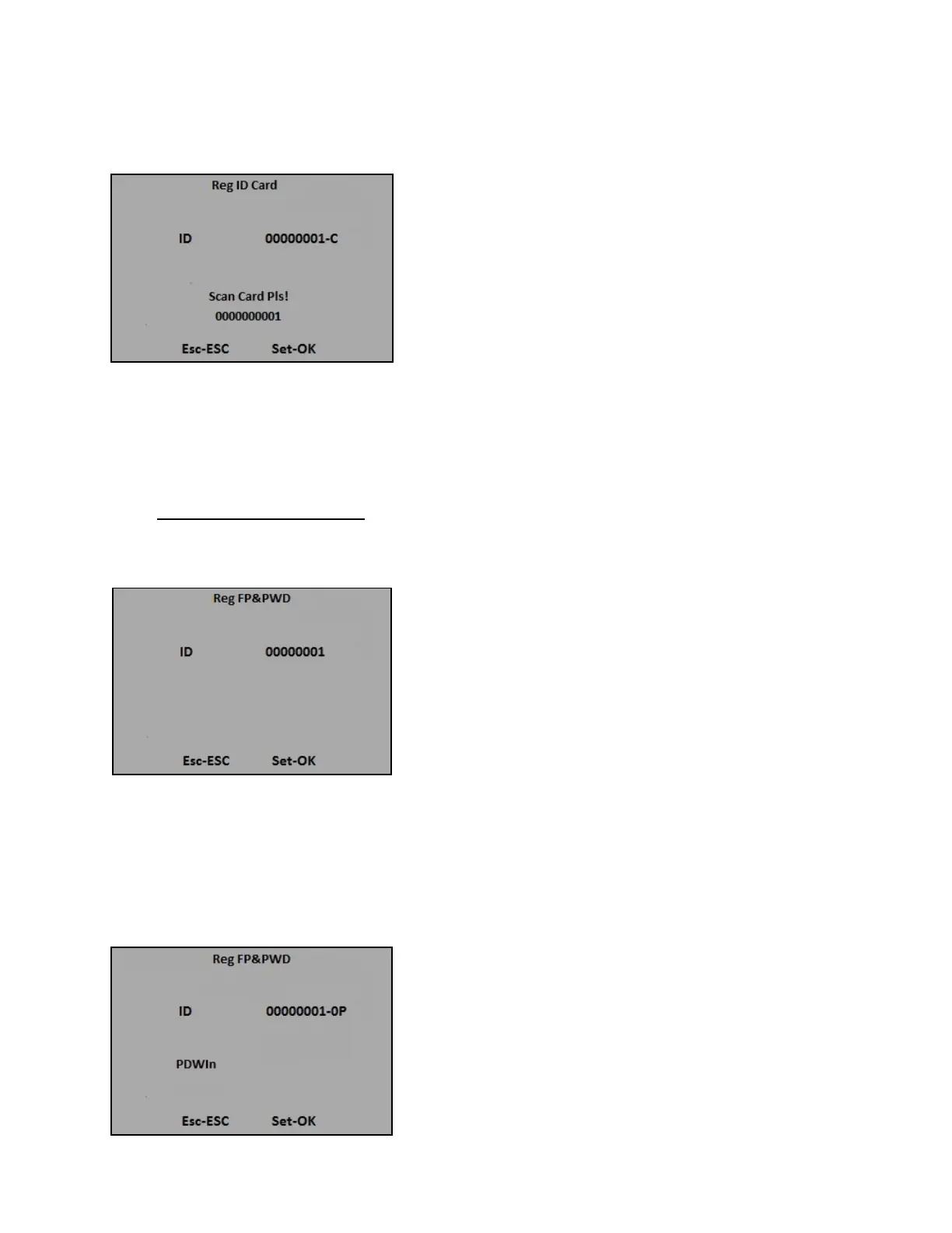 1) Select FP&Pass, then press [OK], for new user enrollment, the following message appears