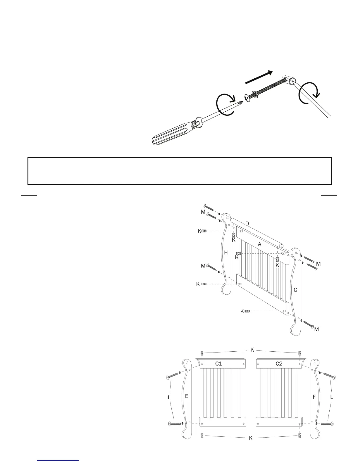 Attach the right (H) and left (G) rear legs, headboard