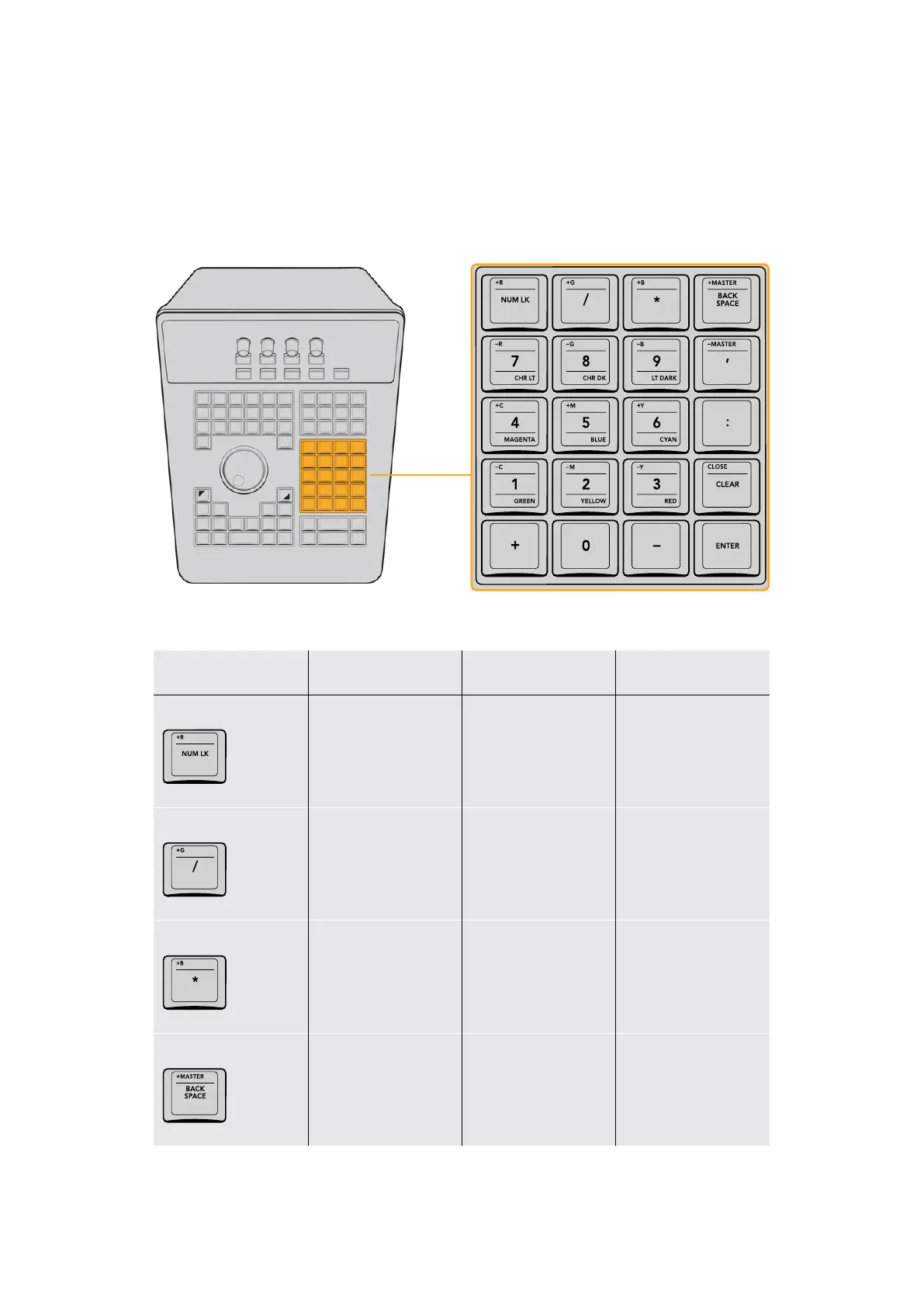 you will find numbers 0 to 9 and associated keys for entering timecode and clip numbers.