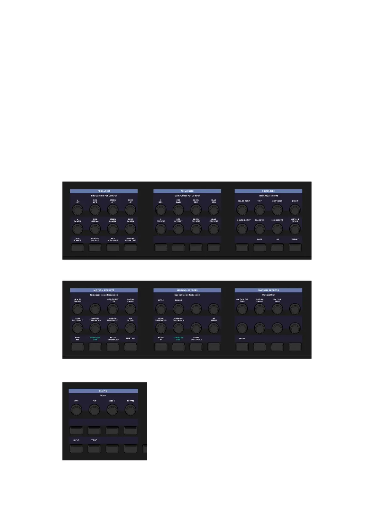 Each of the three panels have soft controls. These controls appear on top of an LCD display