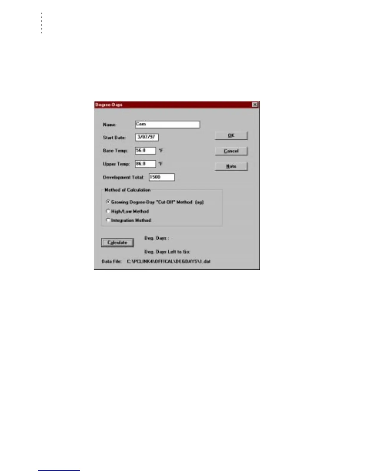 the dialog box, the name of the data file for this degree-day totals is displayed.