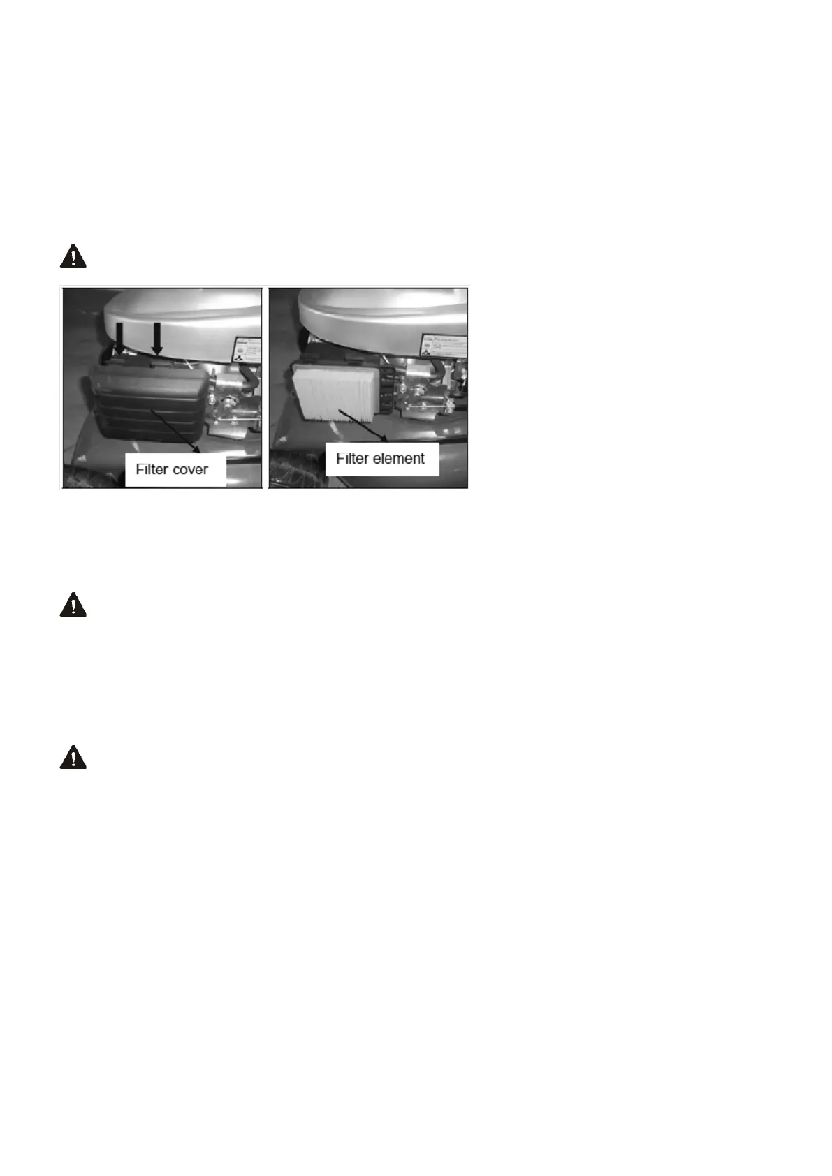 after 25 hours normal mowing. The foam element must be serviced regularly if the mower is used in dry dusty conditions.