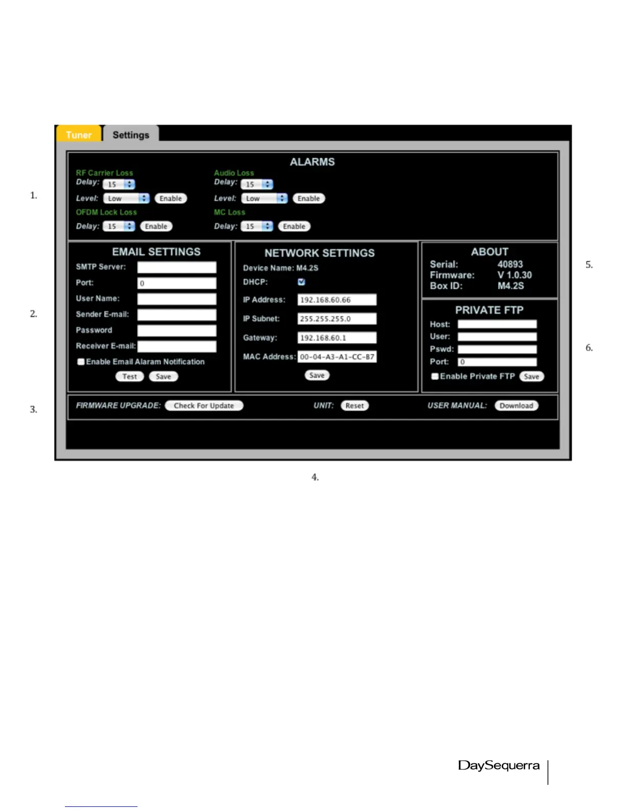 2. Email Settings window – configures the M4.2S for email alerts when Alarm conditions become
