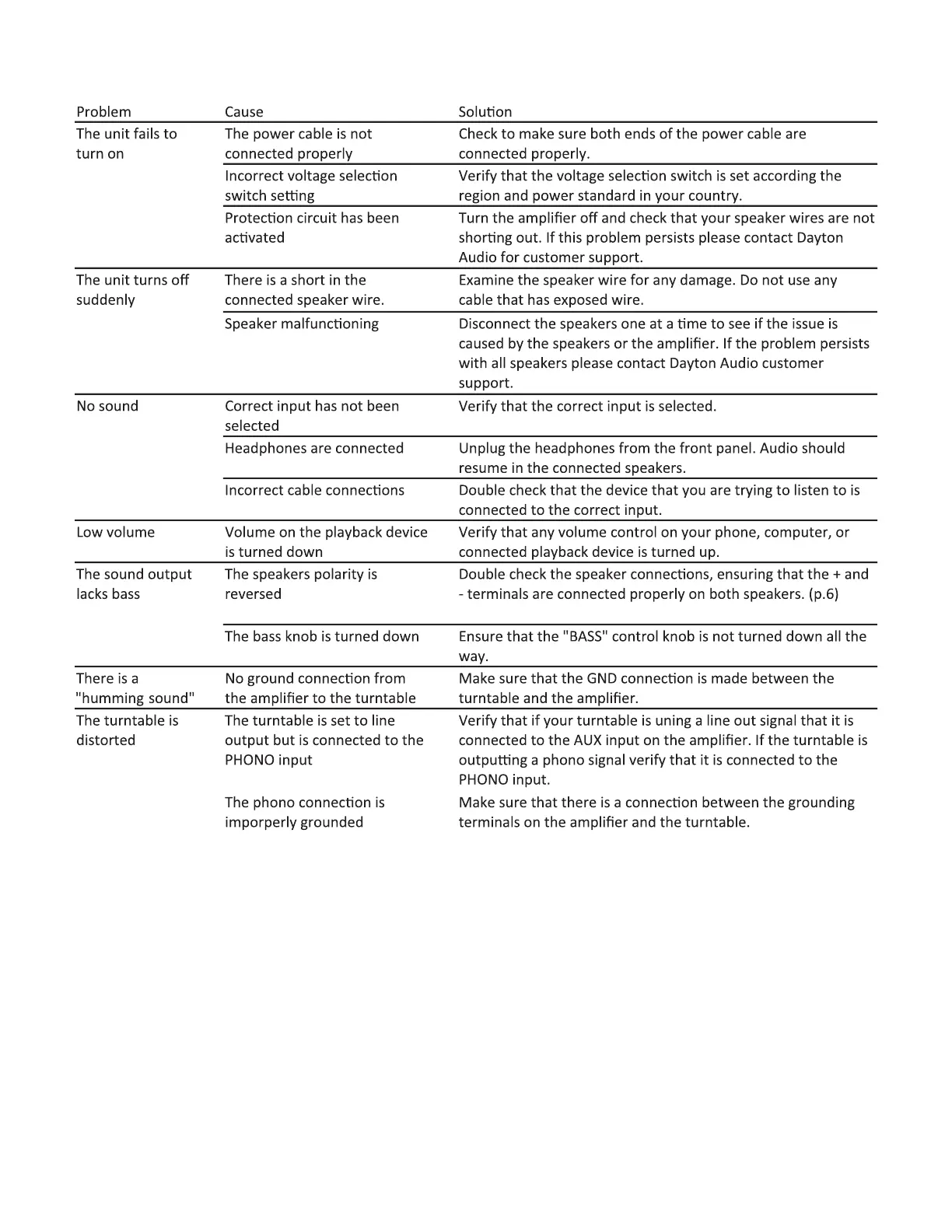DaytonAudio HTA100 - Troubleshooting Common Issues; Power and Sound Problems; Audio Quality and Noise